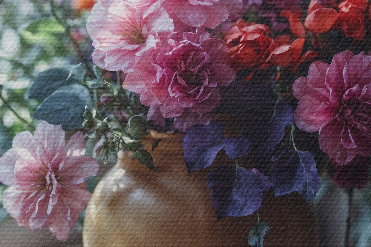 Drei Materialtypen stehen zur Verfügung: Economic Canvas - ein dichtes und haltbares Material für den Digitaldruck, identisch mit Malerleinwand, wasserfeste Oberfläche, realistische Wiedergabe von Details, mittelkörniges Material. Premium Canvas - die Textur ähnelt der einer Malerleinwand (verwobene kleine Fäden). Weiche, detaillierte Wiedergabe des Bildes auf einer matten Oberfläche. Eco-Premium - hochwertiges Gewebe aus 100% Baumwolle. Dank der natürlichen Baumwollfasern ist das Material langlebig und verschleißfest. Hervorragende Farbwiedergabe und Detailtreue.