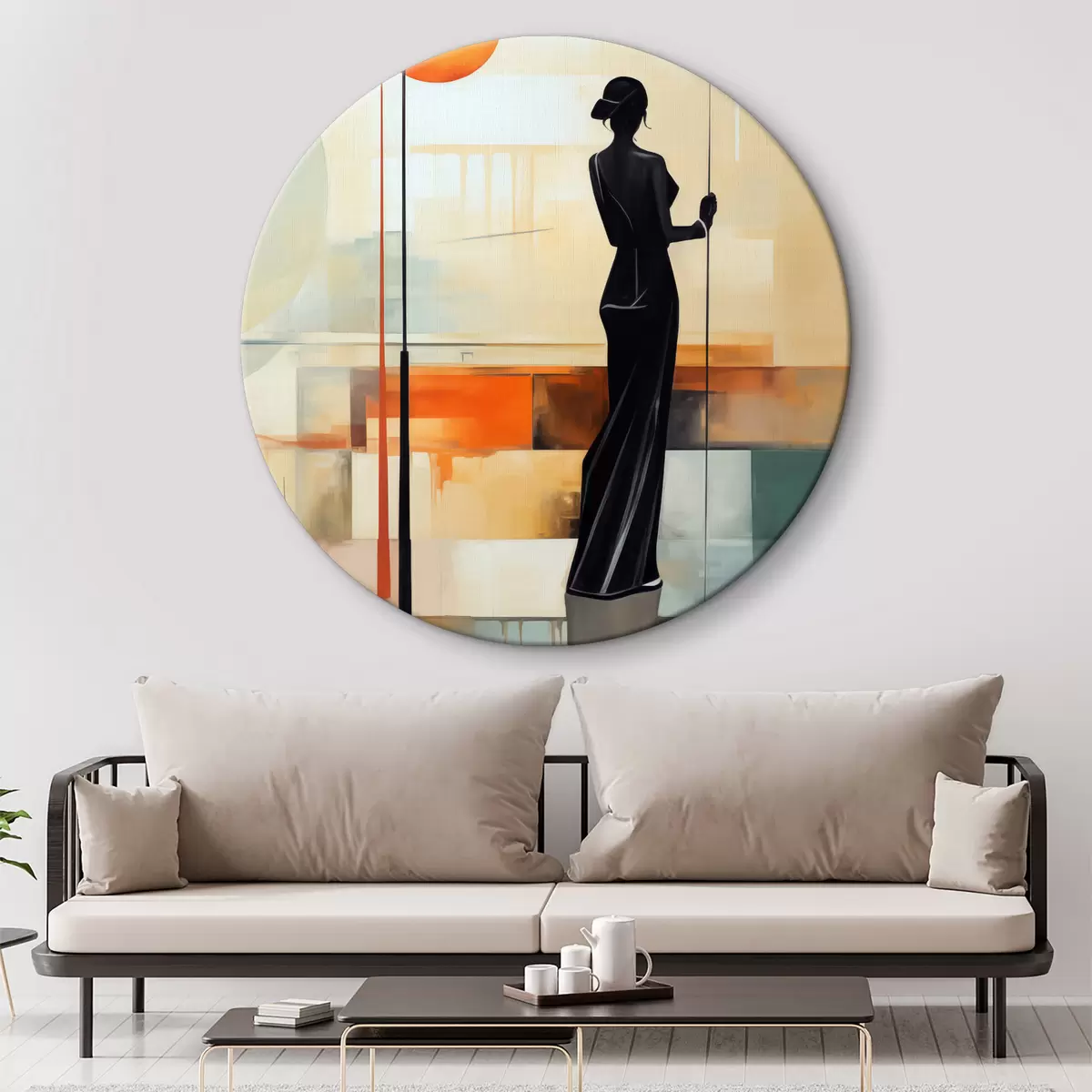 Runde Wandbilder Schwarze weibliche Silhouette mit einem Billardqueue in den Händen, kubistische Malerei, Farbe blau, beige, gelb Nr r39197