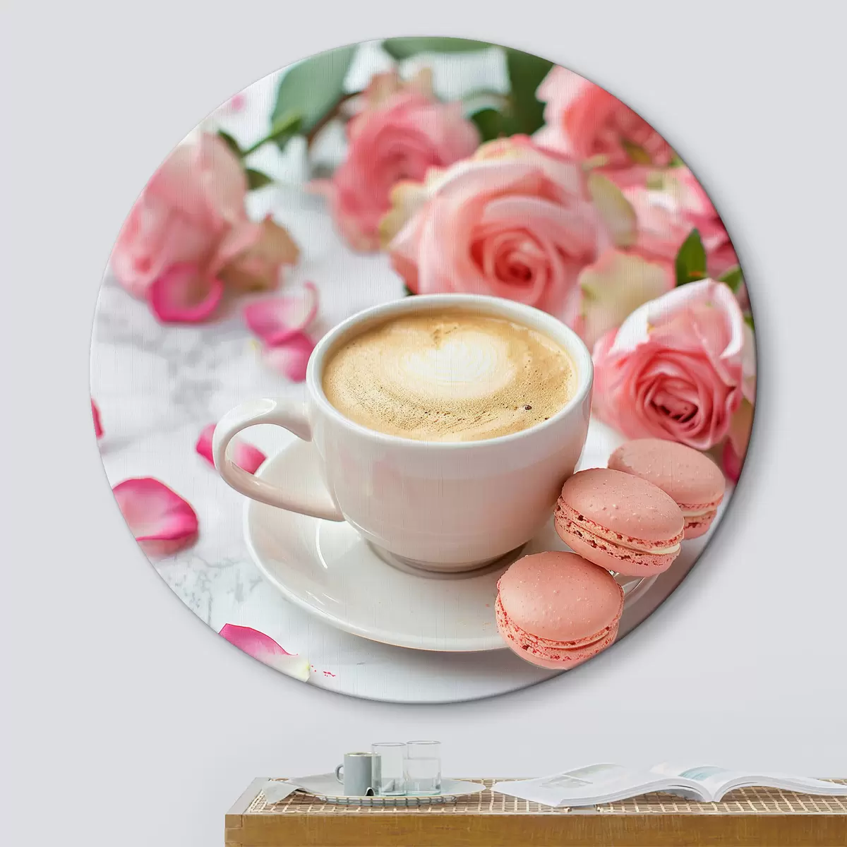 Runde Wandbilder Cappuccino-Macarons und Rosen r39231