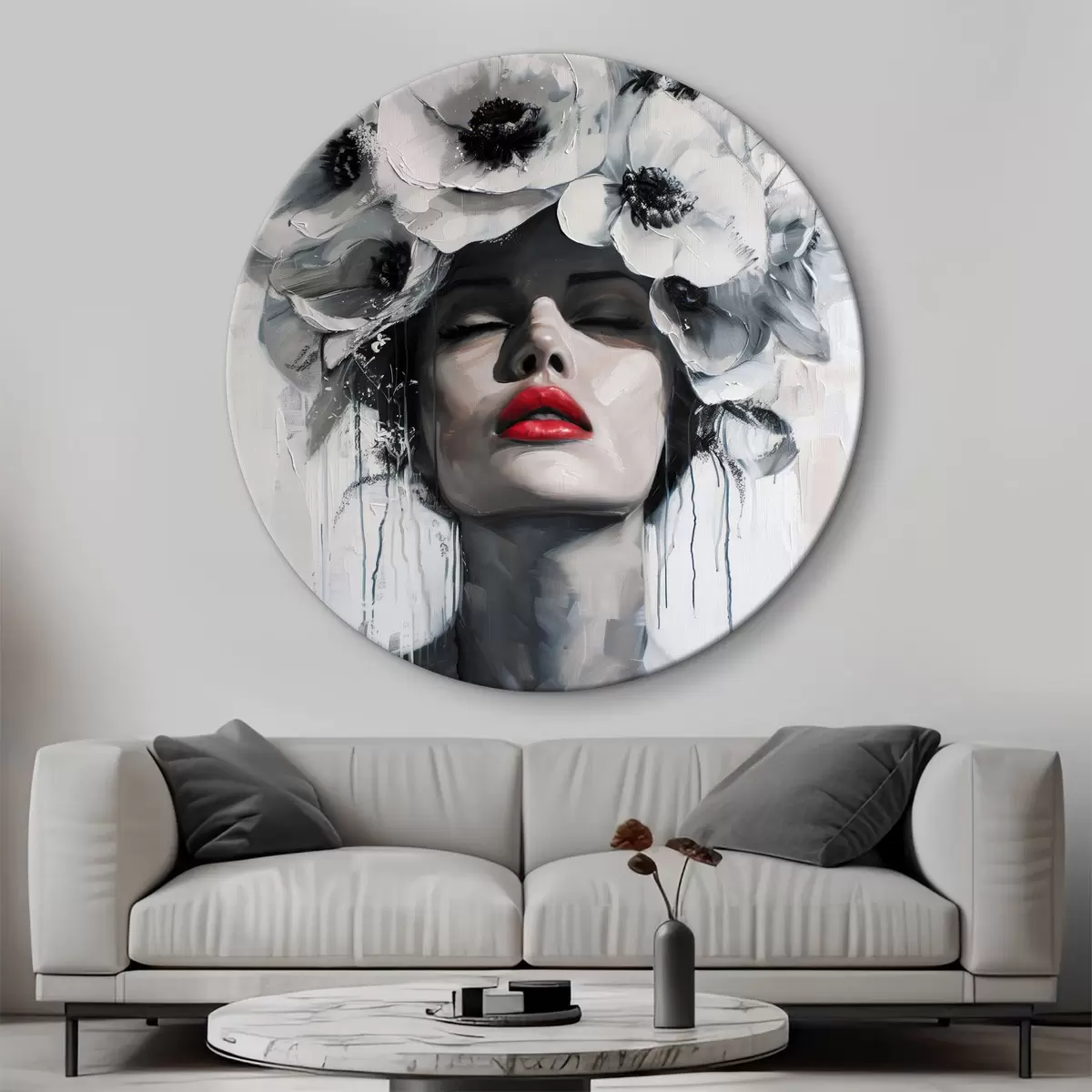 Runde Wandbilder Portrait einer Frau mit Blumen im Haar und roten Lippen Nr r39253