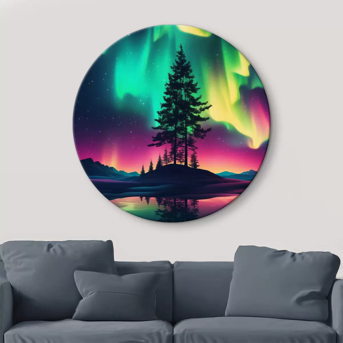 Runde Wandbilder Nordlichter über Weihnachtsbäumen r39366
