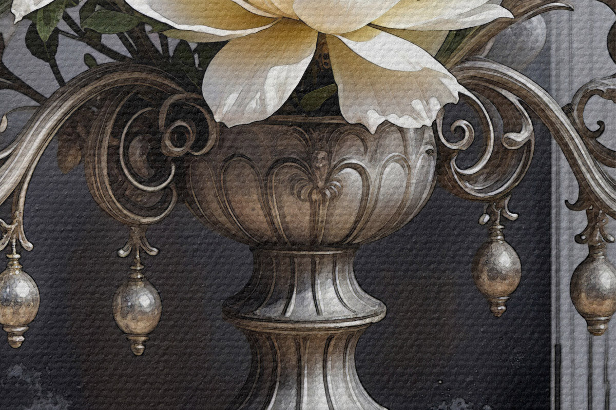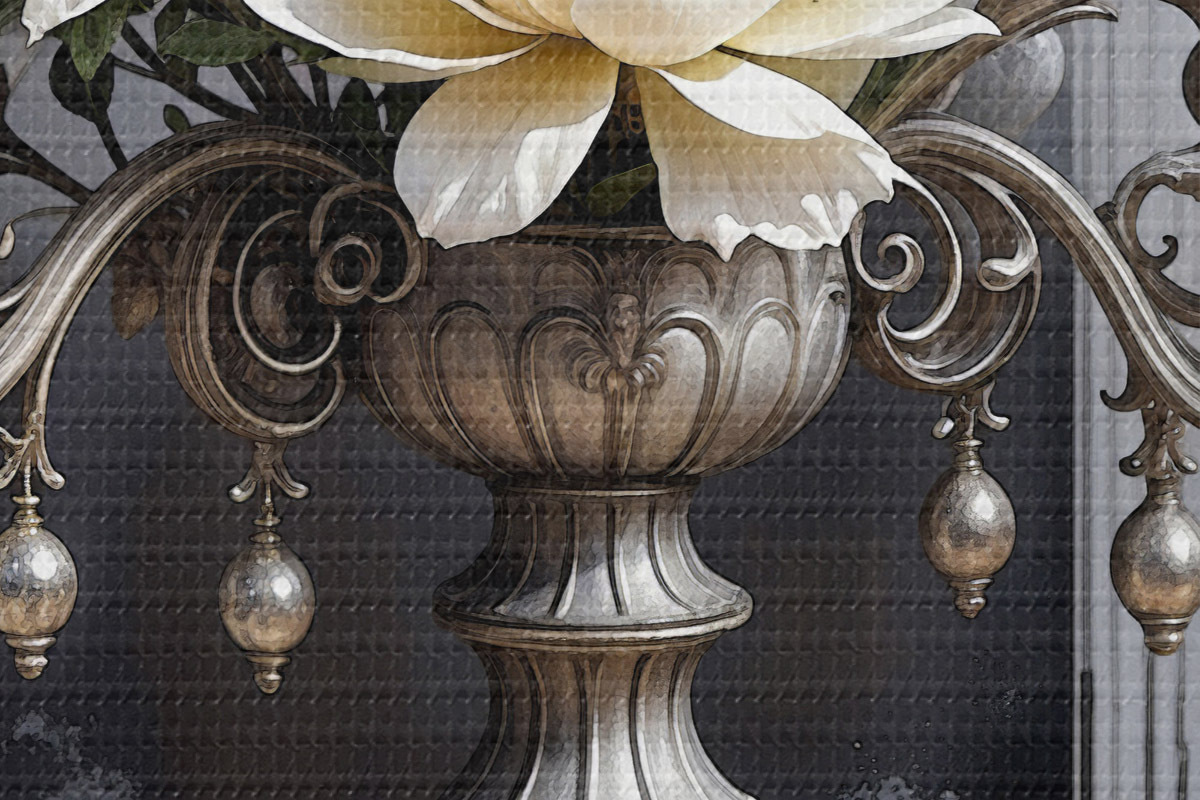 Runde Wandbilder Ein Strauß großer weißer Dahlienblüten in einer verzierten silbernen Vase, umgeben von brennenden Kerzen auf einem Holztisch Nr r39384