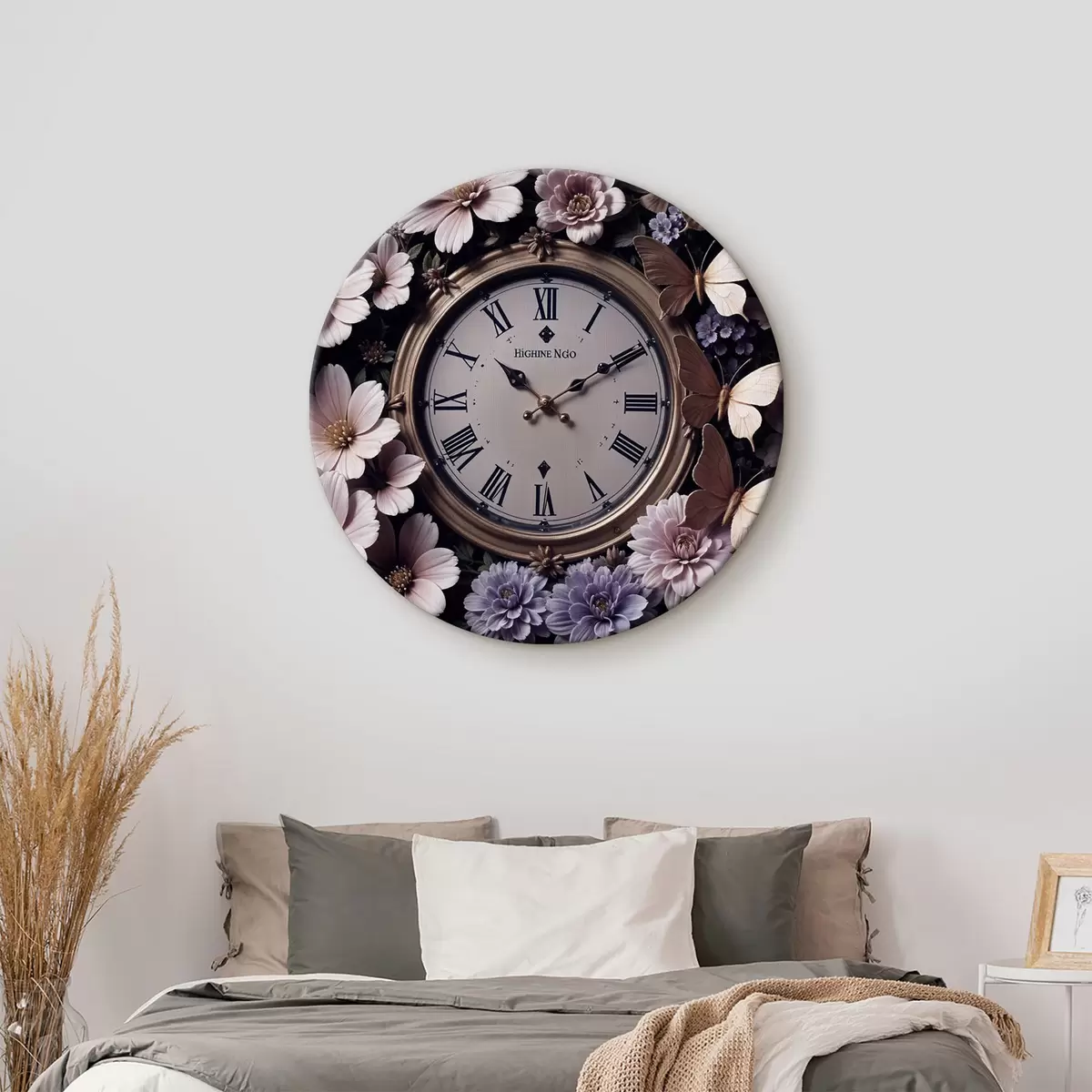 Runde Wandbilder Eine antike Uhr, umgeben von wunderschönen lila und rosa Blumen vor einem dunklen Hintergrund Nr r39386