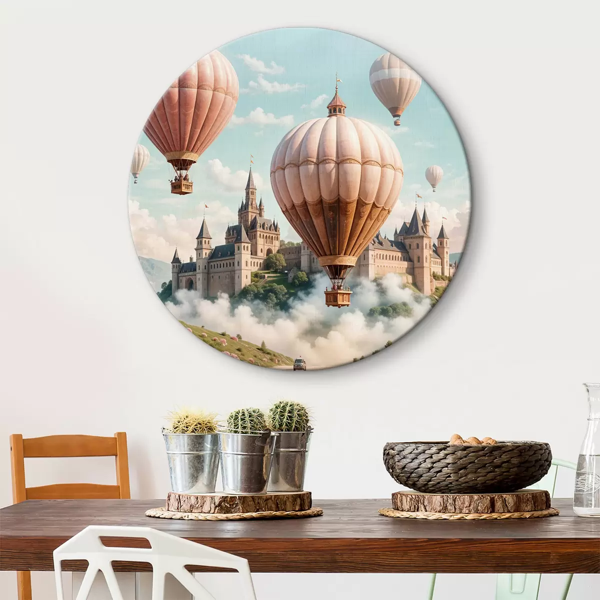 Runde Wandbilder Ein Fantasieschloss, umgeben von rosa Heißluftballons, die in einem wolkigen Himmel über einer üppigen, grünen Landschaft schweben Nr r39387
