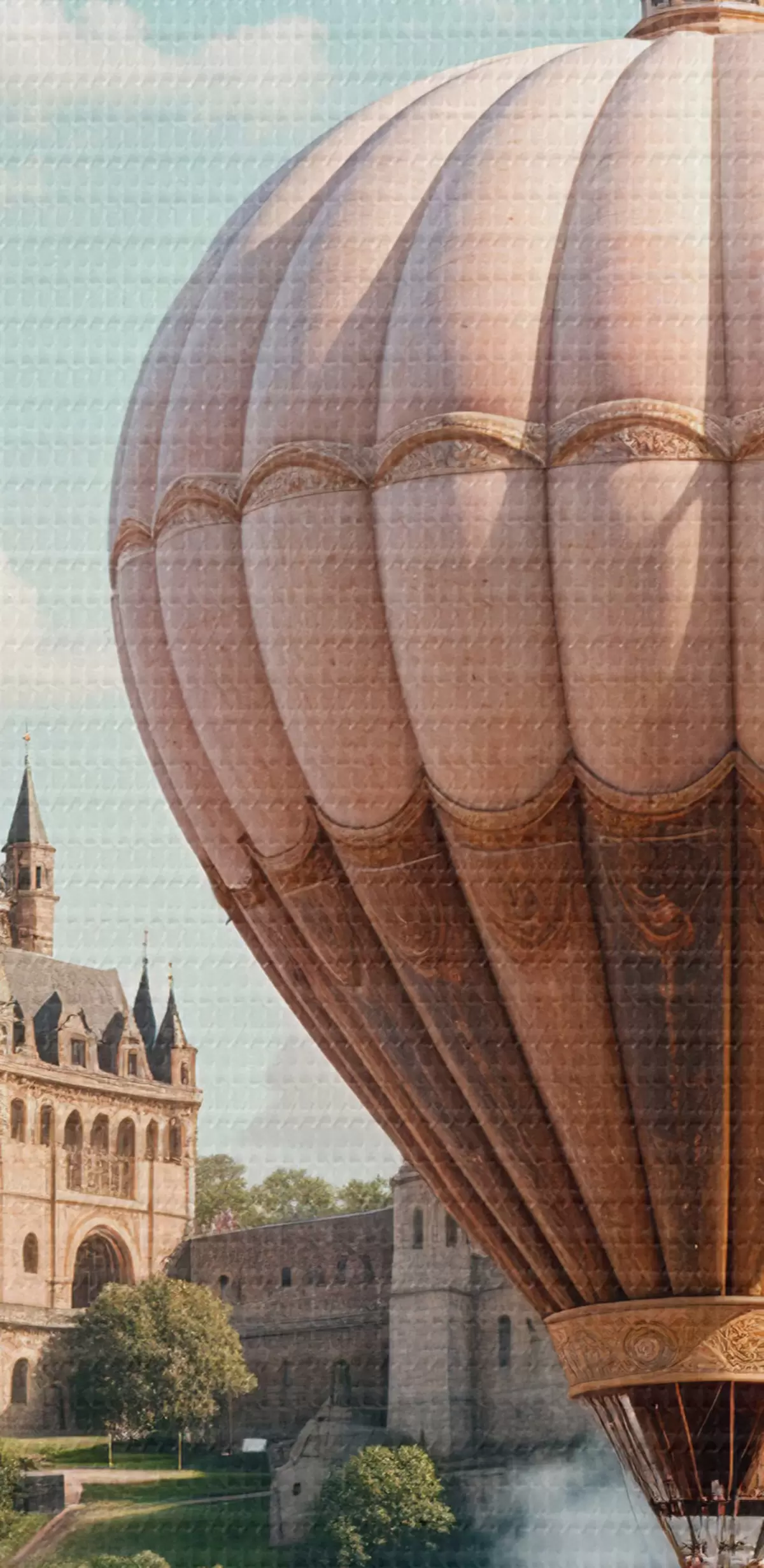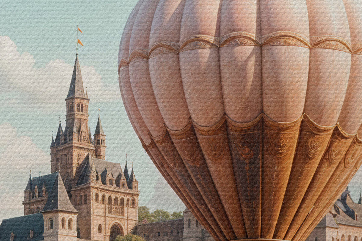 Runde Wandbilder Ein Fantasieschloss, umgeben von rosa Heißluftballons, die in einem wolkigen Himmel über einer üppigen, grünen Landschaft schweben r39387
