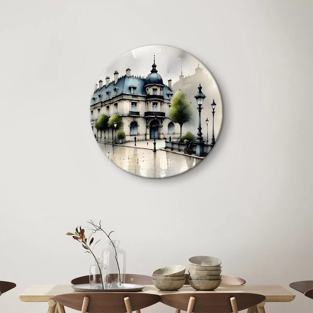 Runde Wandbilder Ein großartiges Gebäude Aquarell Kunst umgeben von Laternen und Bäumen, an einem regnerischen Tag Nr r39391