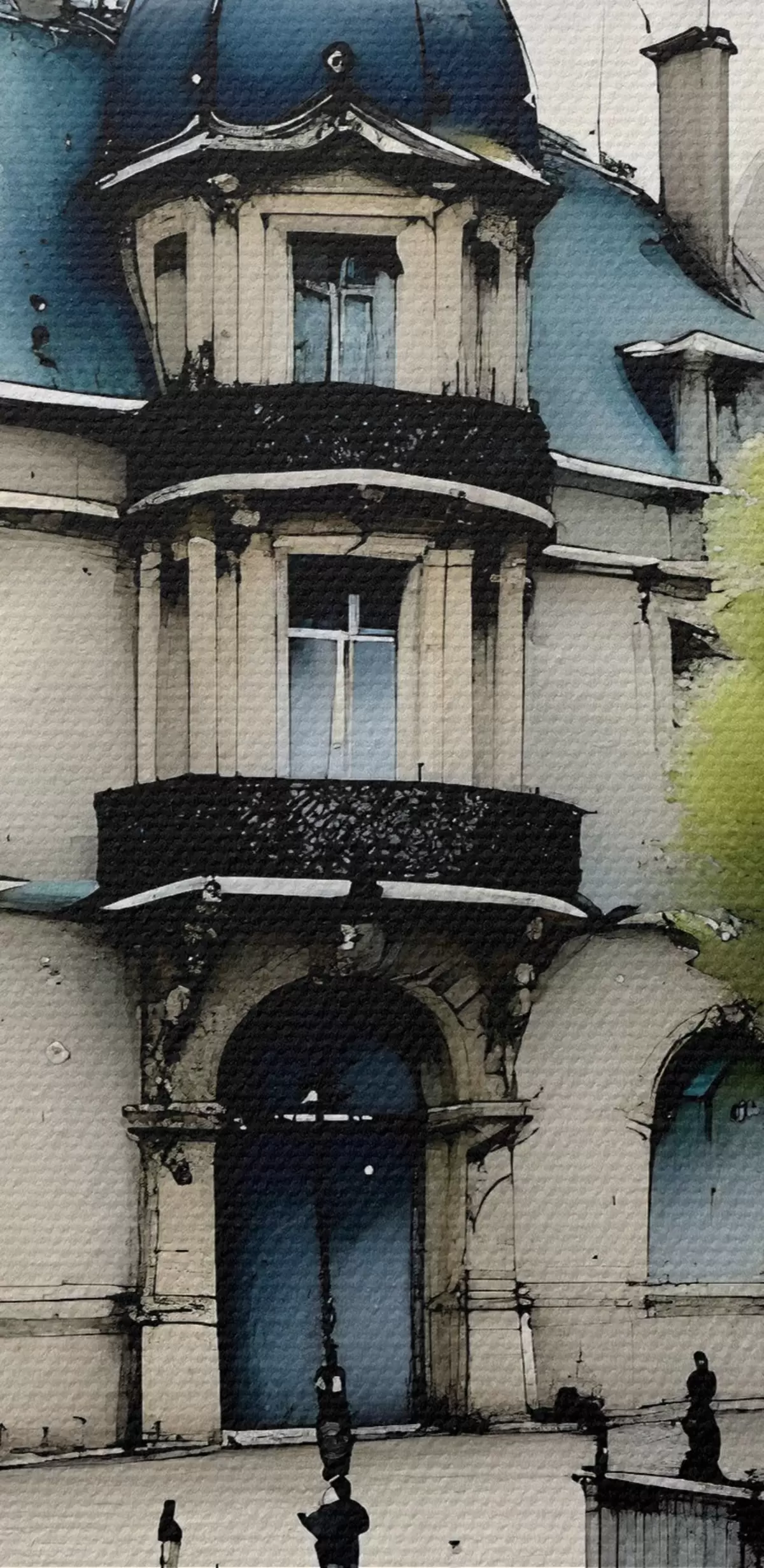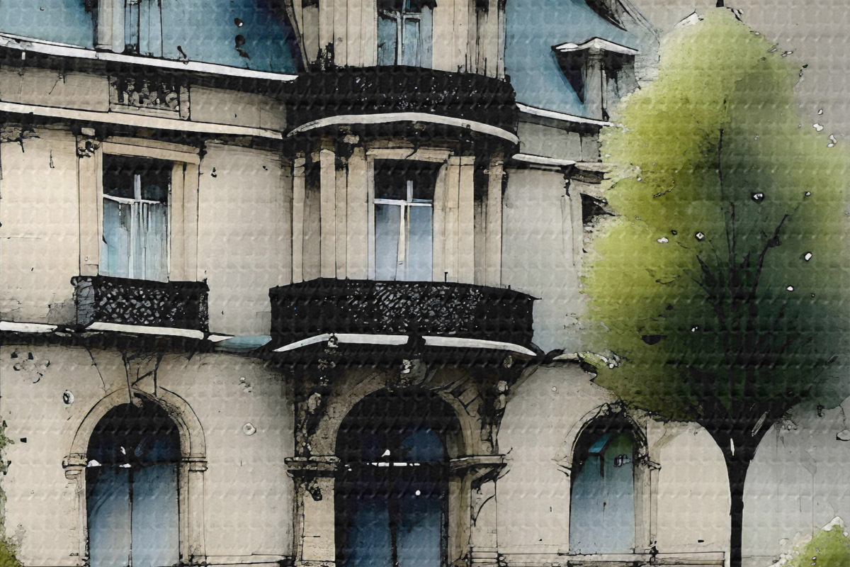 Runde Wandbilder Ein großartiges Gebäude Aquarell Kunst umgeben von Laternen und Bäumen, an einem regnerischen Tag r39391