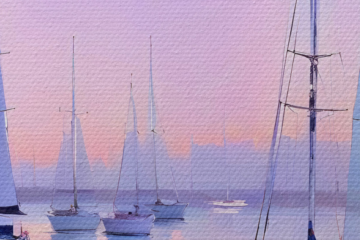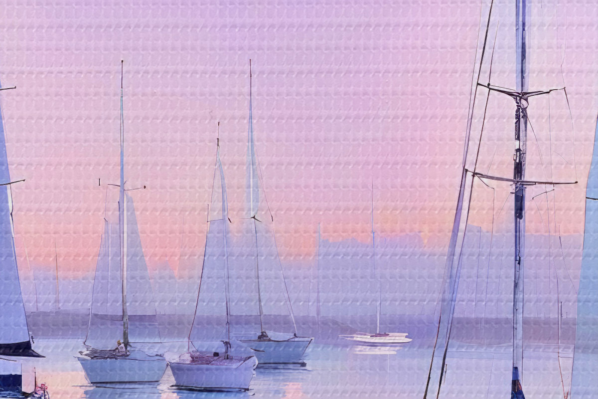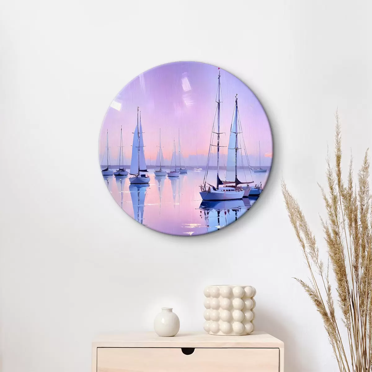 Runde Wandbilder Segelboote auf einem ruhigen See bei Sonnenuntergang, wobei sich die Boote im stillen Wasser spiegeln. Landschaftskunst r39398