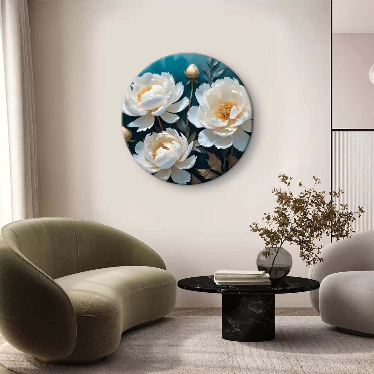 Runde Wandbilder Weiße Pfingstrosenblüten mit Zentren vor einem dunkelgrauen Hintergrund Nr r39405