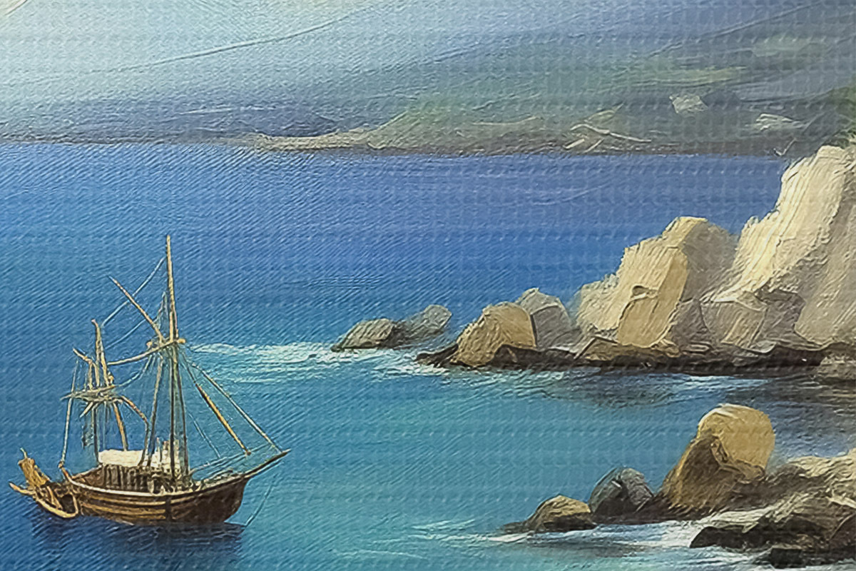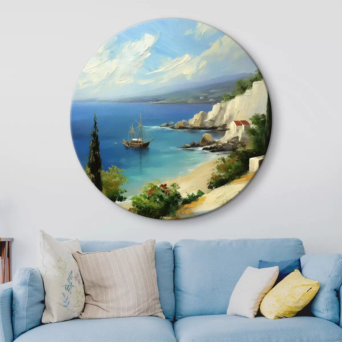Runde Wandbilder Griechische Küste, Schiff, blaues Wasser, Ölgemälde, Sommernatur, Felsen, lebendige Pinselstriche r39425