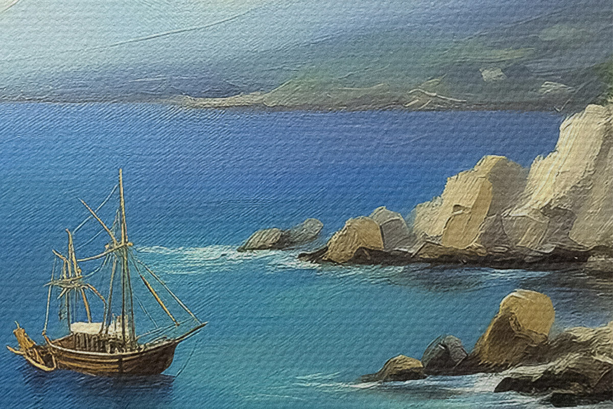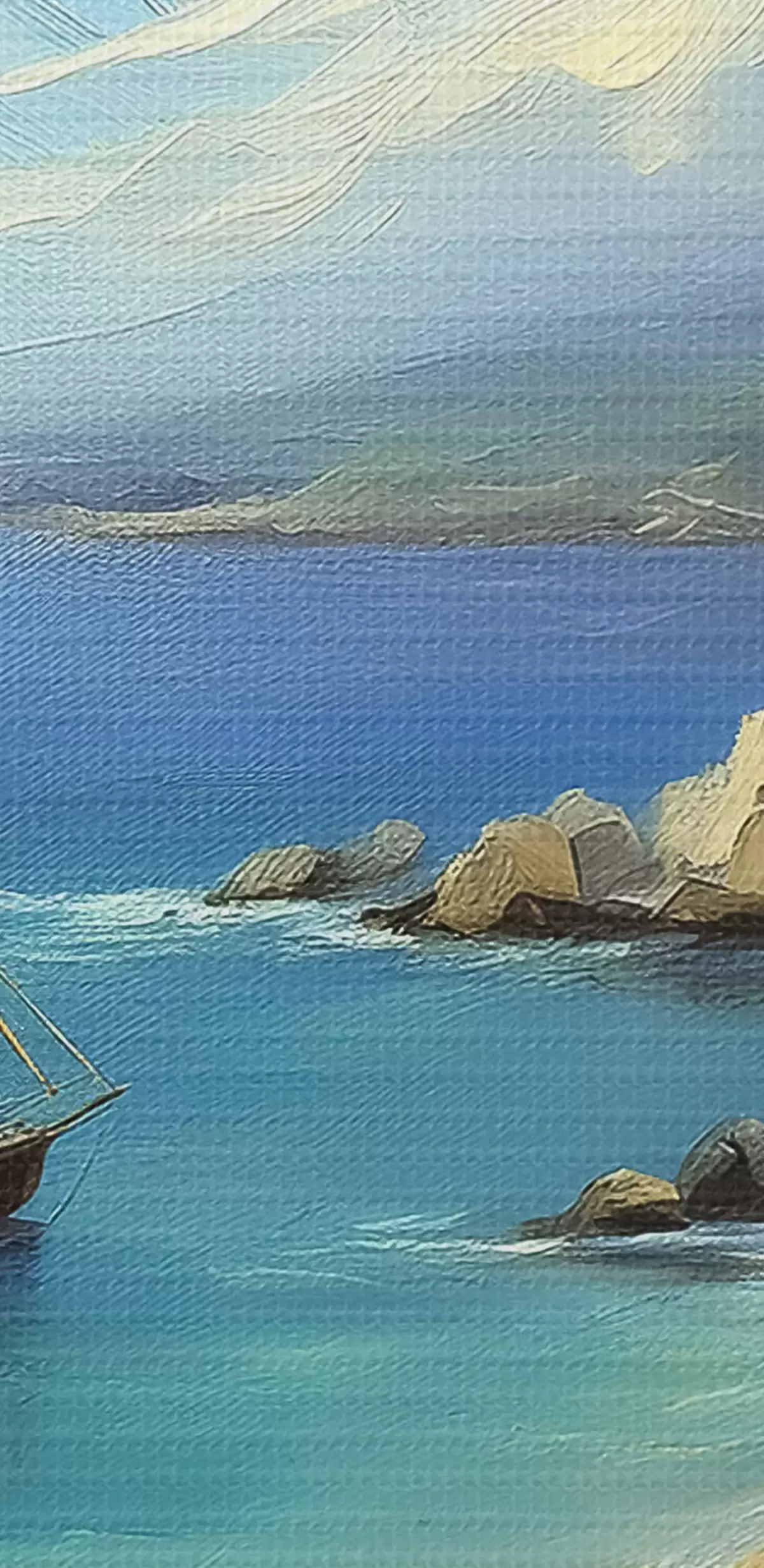 Runde Wandbilder Griechische Küste, Schiff, blaues Wasser, Ölgemälde, Sommernatur, Felsen, lebendige Pinselstriche Nr r39425