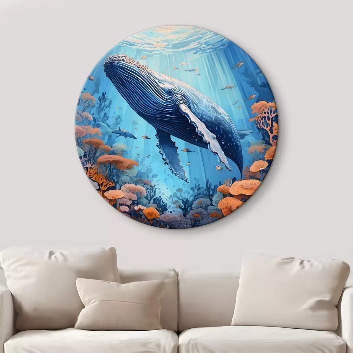 Runde Wandbilder Meereswale, Korallenriffe, Fische, Sonnenlicht, Aquamarinfarben, Unterwasserleben Nr r39427