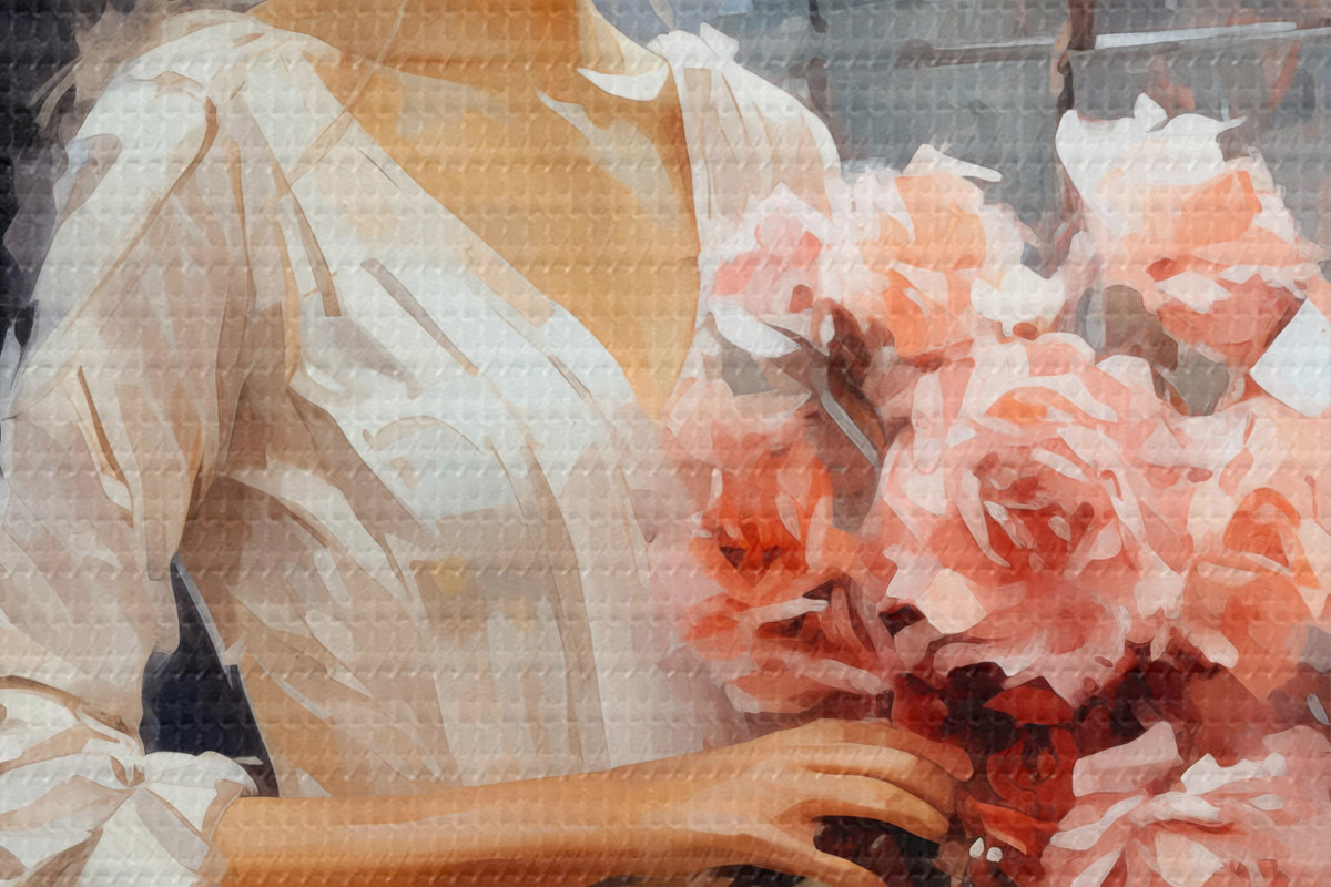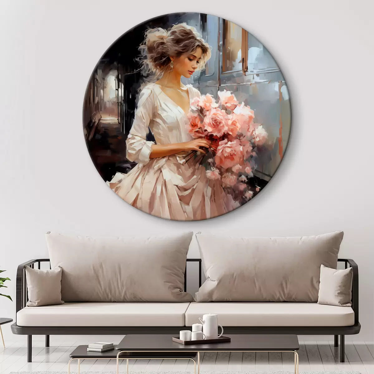 Runde Wandbilder Ein Mädchen in einem weißen Kleid am Bahnhof hält einen Strauß rosa Rosen in ihren Händen Ölgemälde r39438