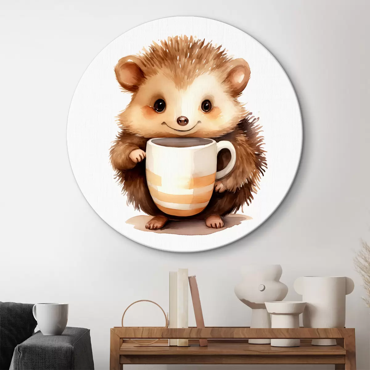 Runde Wandbilder Igel hält eine weiße Tasse in seinen Pfoten Aquarell Kinder Illustration Nr r39440