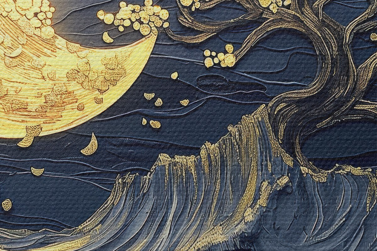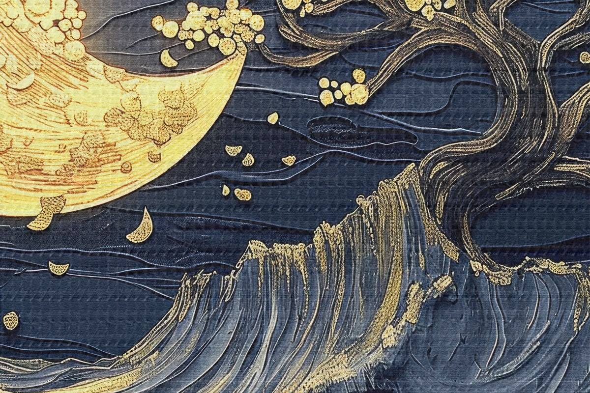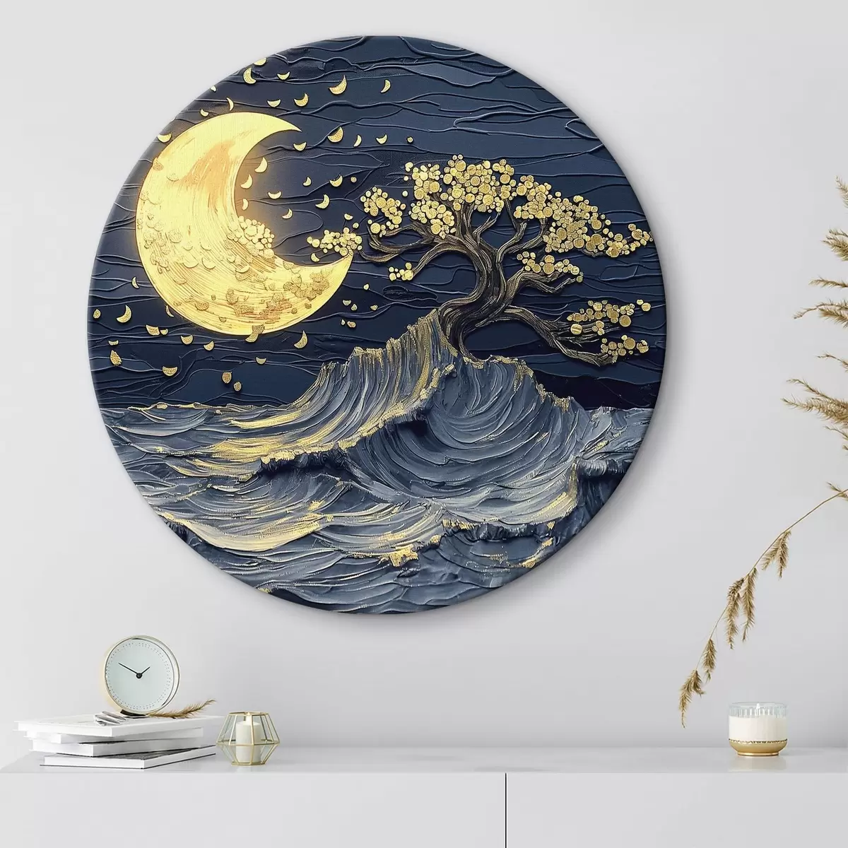 Runde Wandbilder Acrylmalerei: Romantische Seelandschaft mit gefallenen Blättern und Mondscheinreflexen Nr r39449