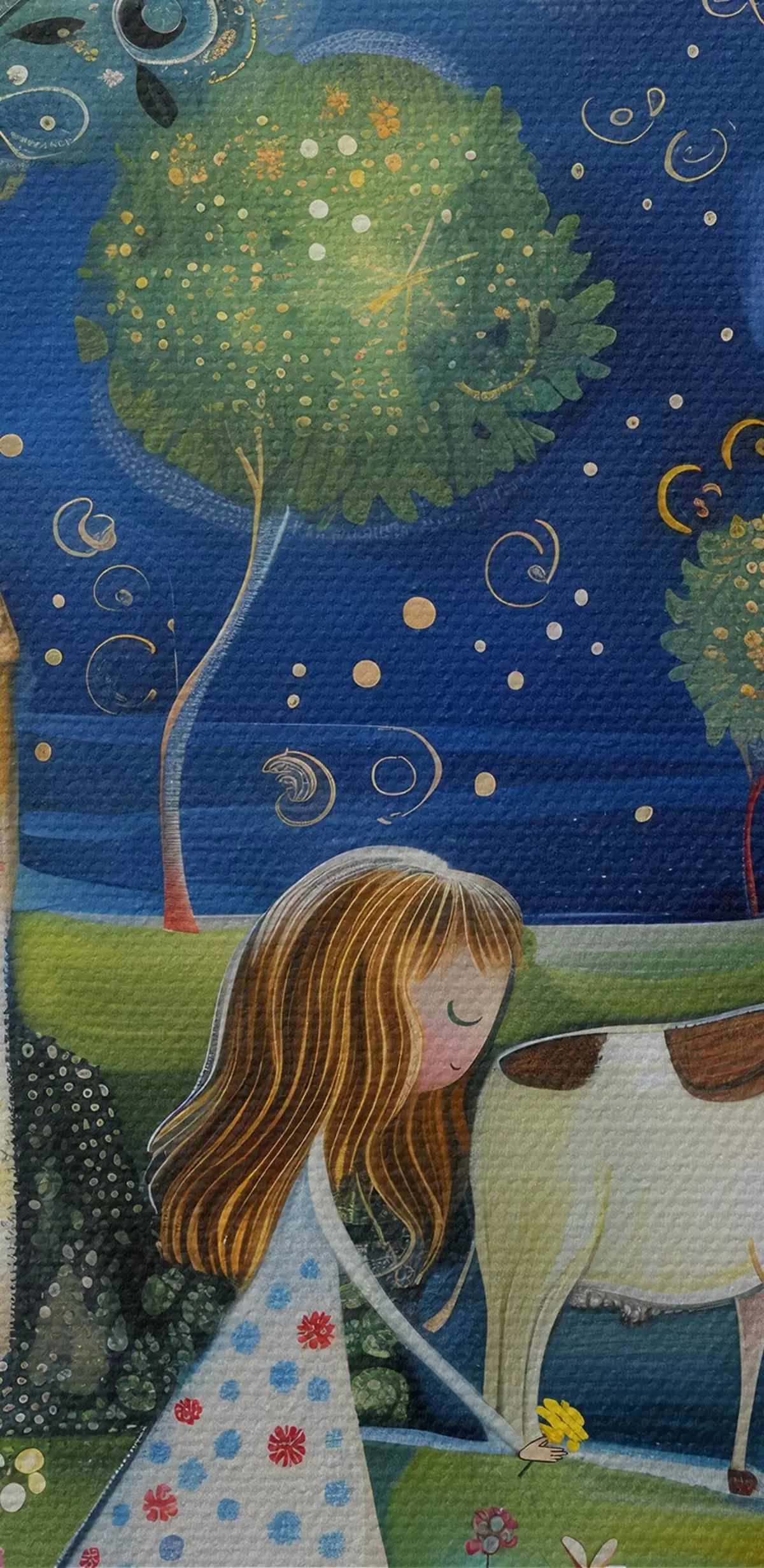 Runde Wandbilder Eine kleine Prinzessin, ein Hund, eine Kuh und ein Fantasiehaus unter den Sternen im skurrilen naiven Kunststil Nr r39451