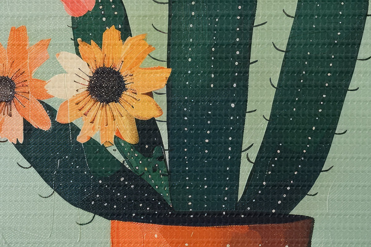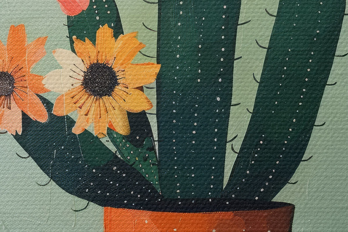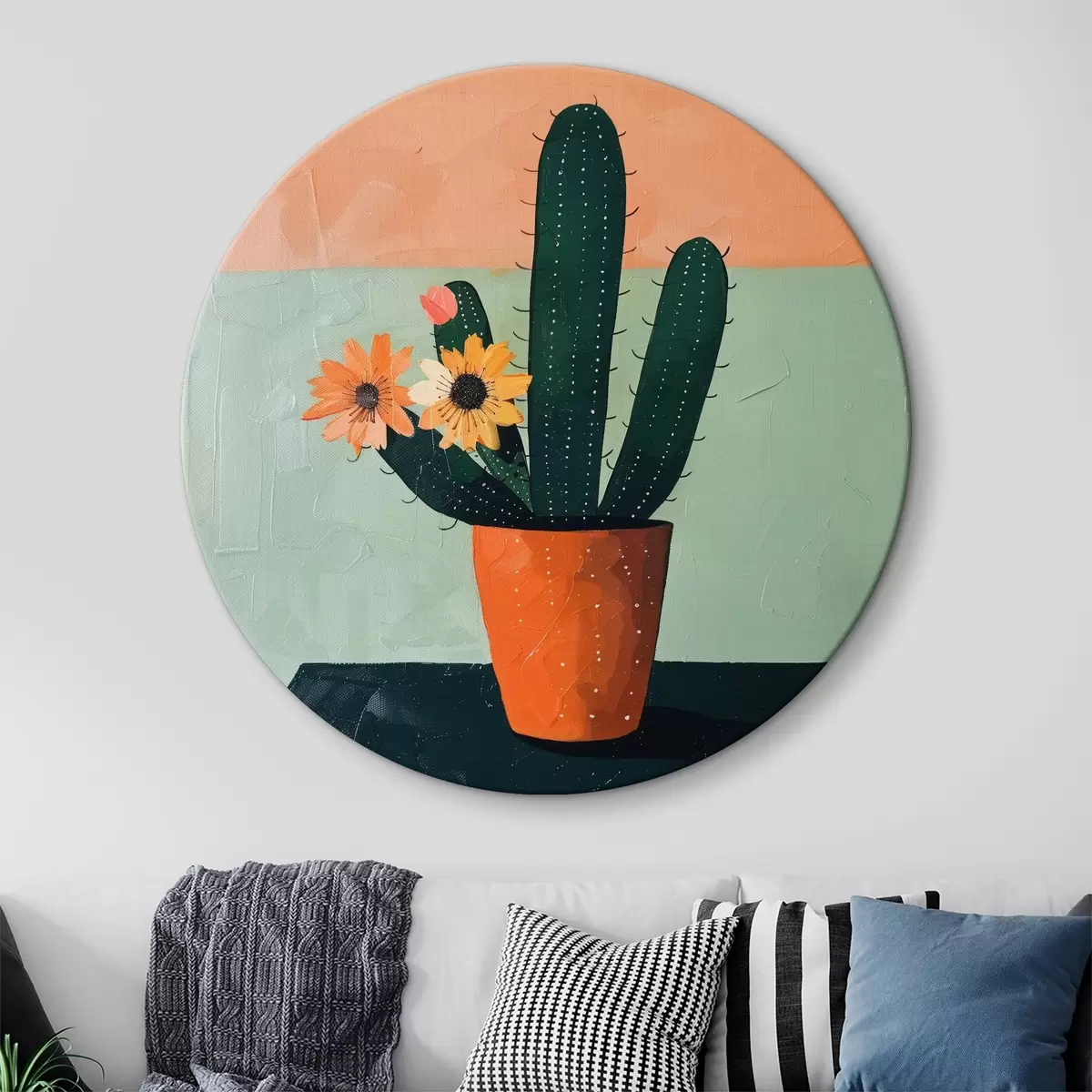 Runde Wandbilder Ein minimalistisches Gemälde eines einzelnen Kaktus mit Blüten in einer kräftigen Farbpalette. r39452