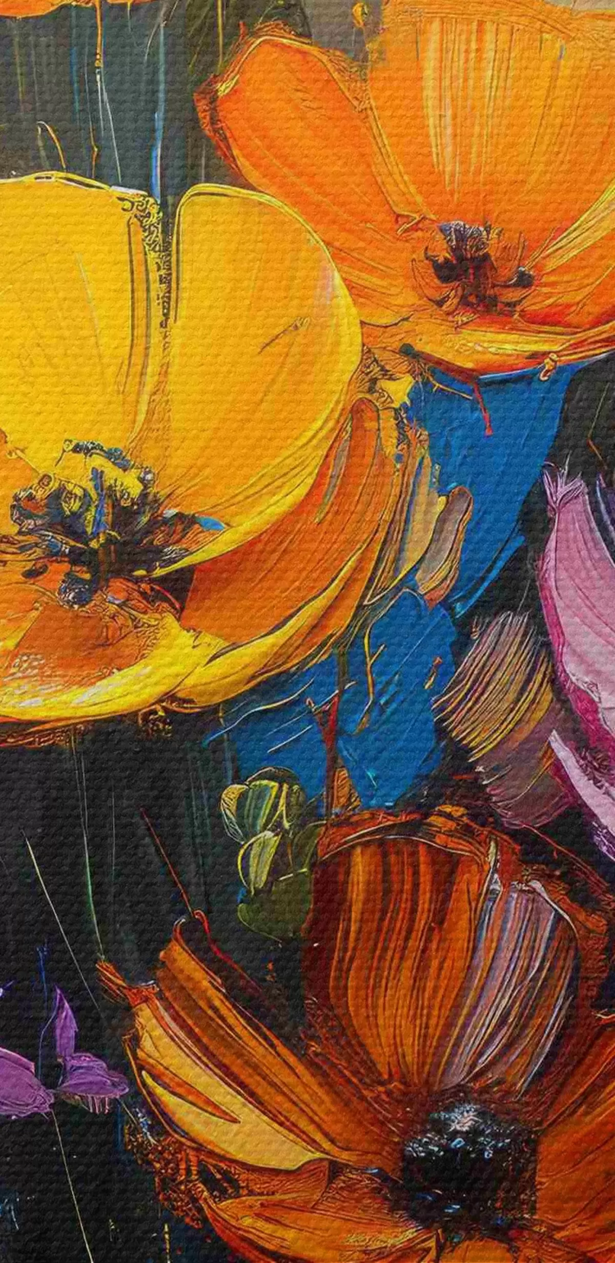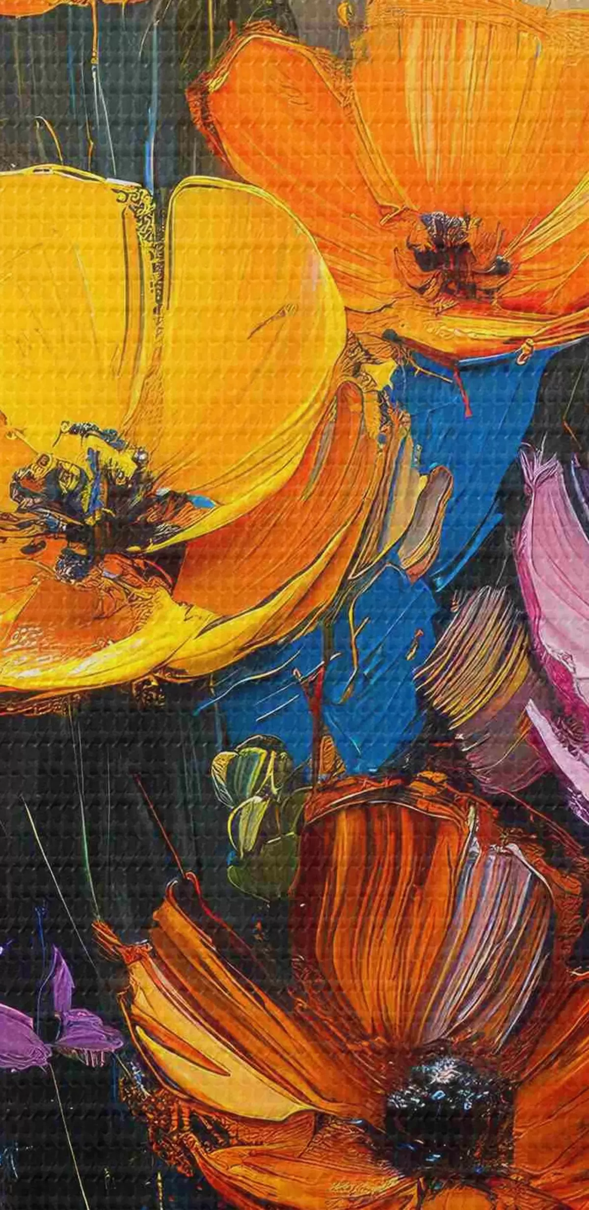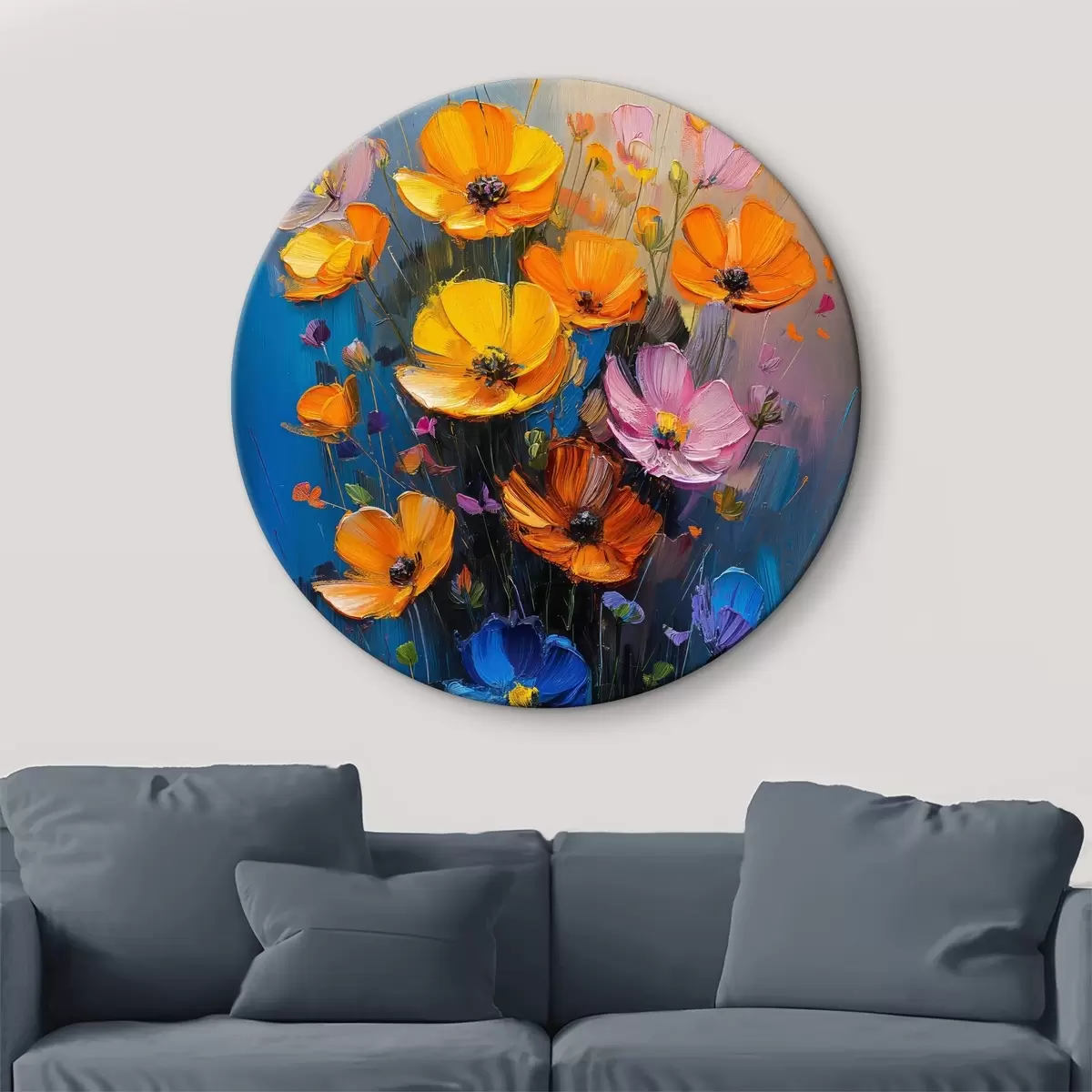 Runde Wandbilder Gemalte Symphonie: hellgelbe, orangefarbene, rosa und blaue Pinselstriche von Mohnblumen. Nr r39454