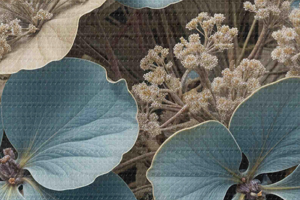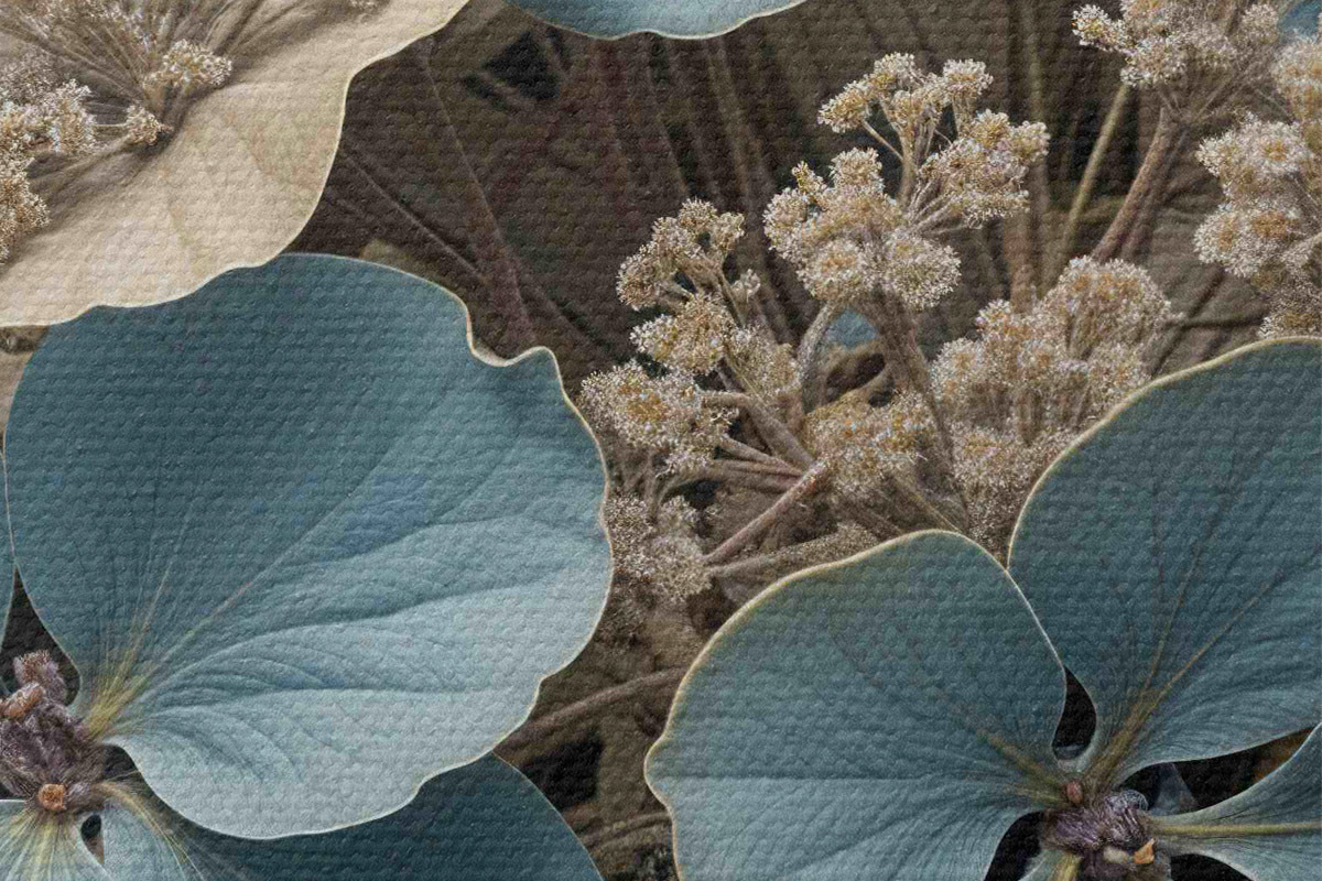 Runde Wandbilder Nahaufnahme von blauen und weißen Blumen mit weichen, verschwommenen Blütenblättern auf einem braunen Hintergrund Nr r39517