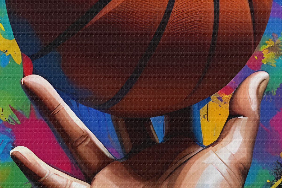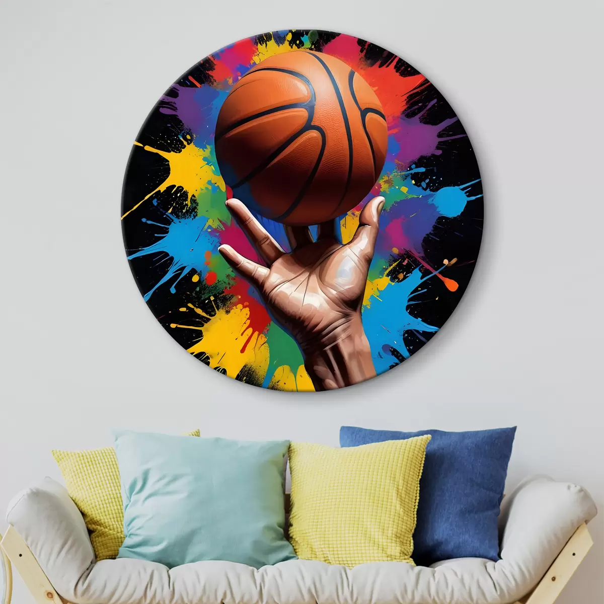 Runde Wandbilder Eine Hand, die einen Basketball vor einem Hintergrund aus bunten Farbspritzern hält Nr r39529