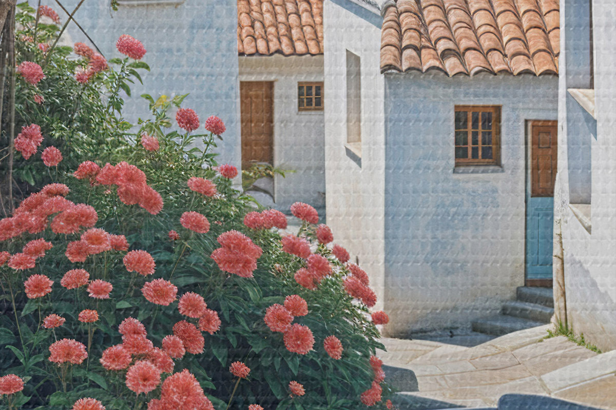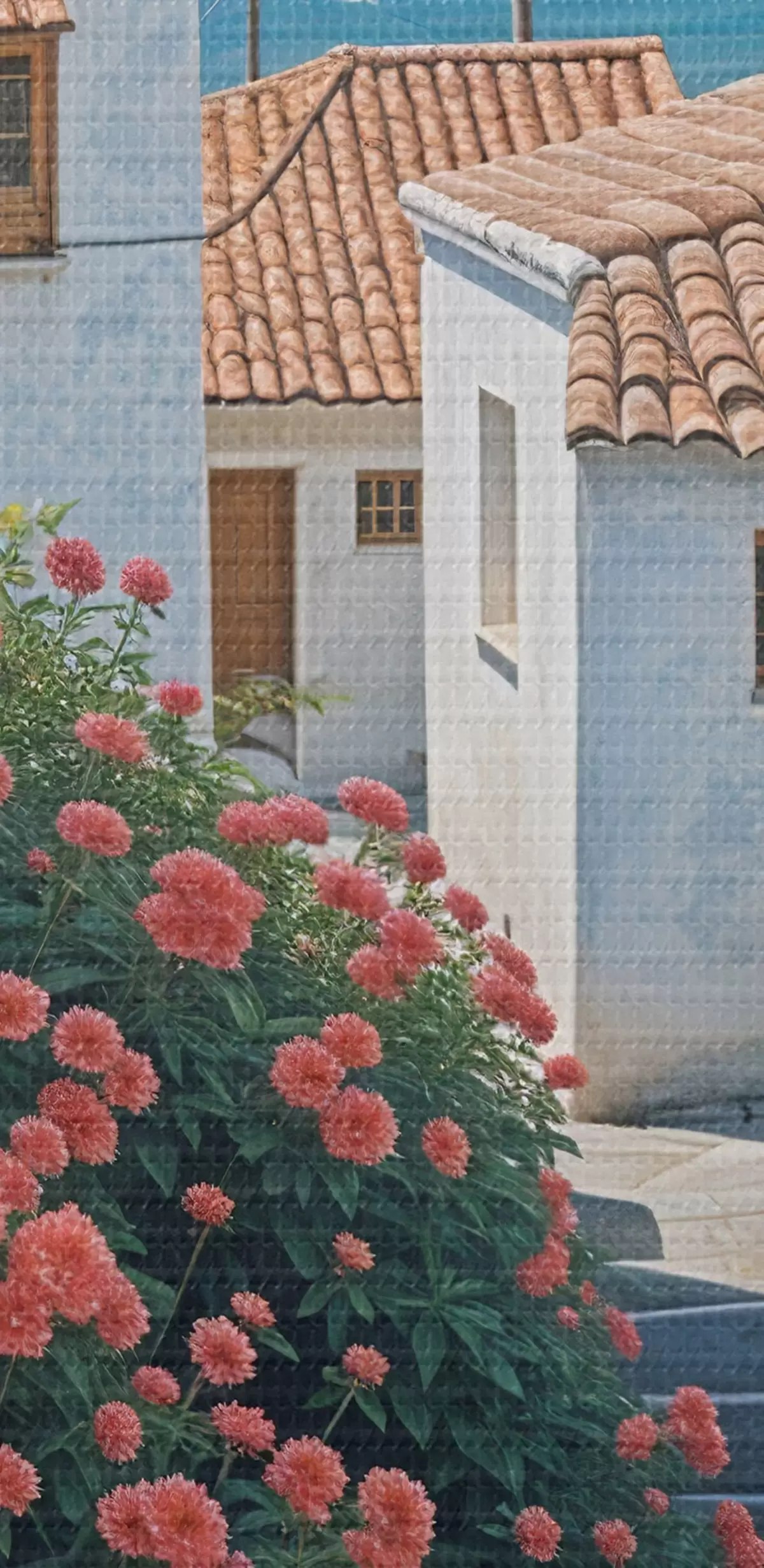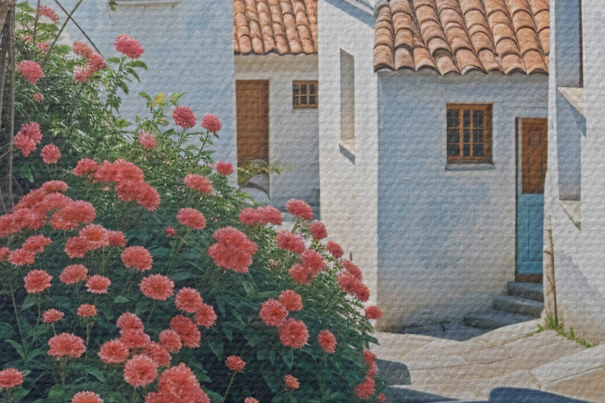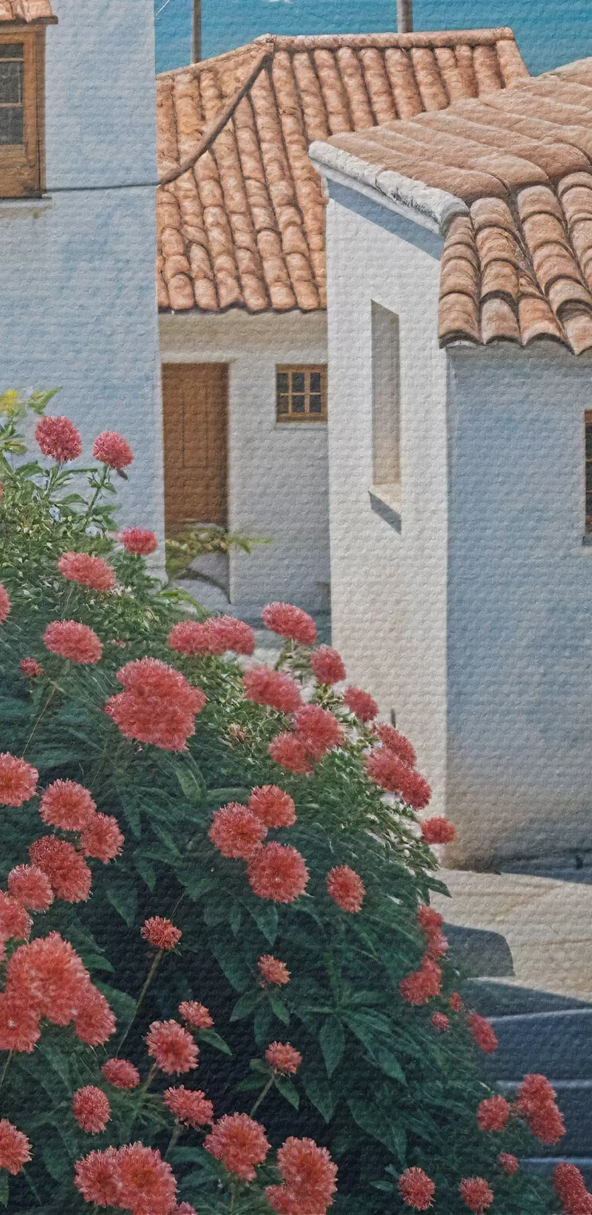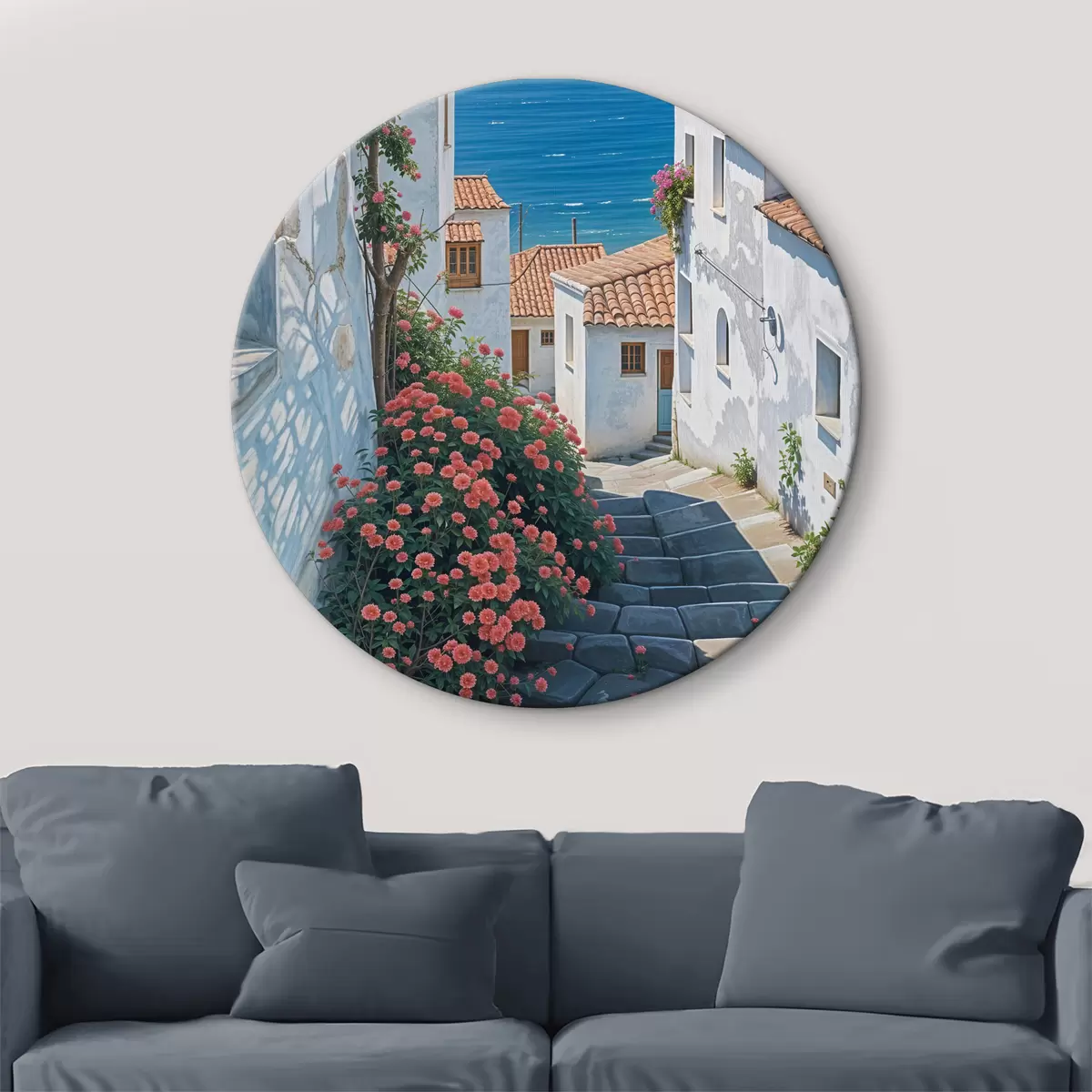 Runde Wandbilder Eine schmale Straße in einer Küstenstadt mit weißen Gebäuden, roten Ziegeldächern und leuchtend rosa Blumen r39532