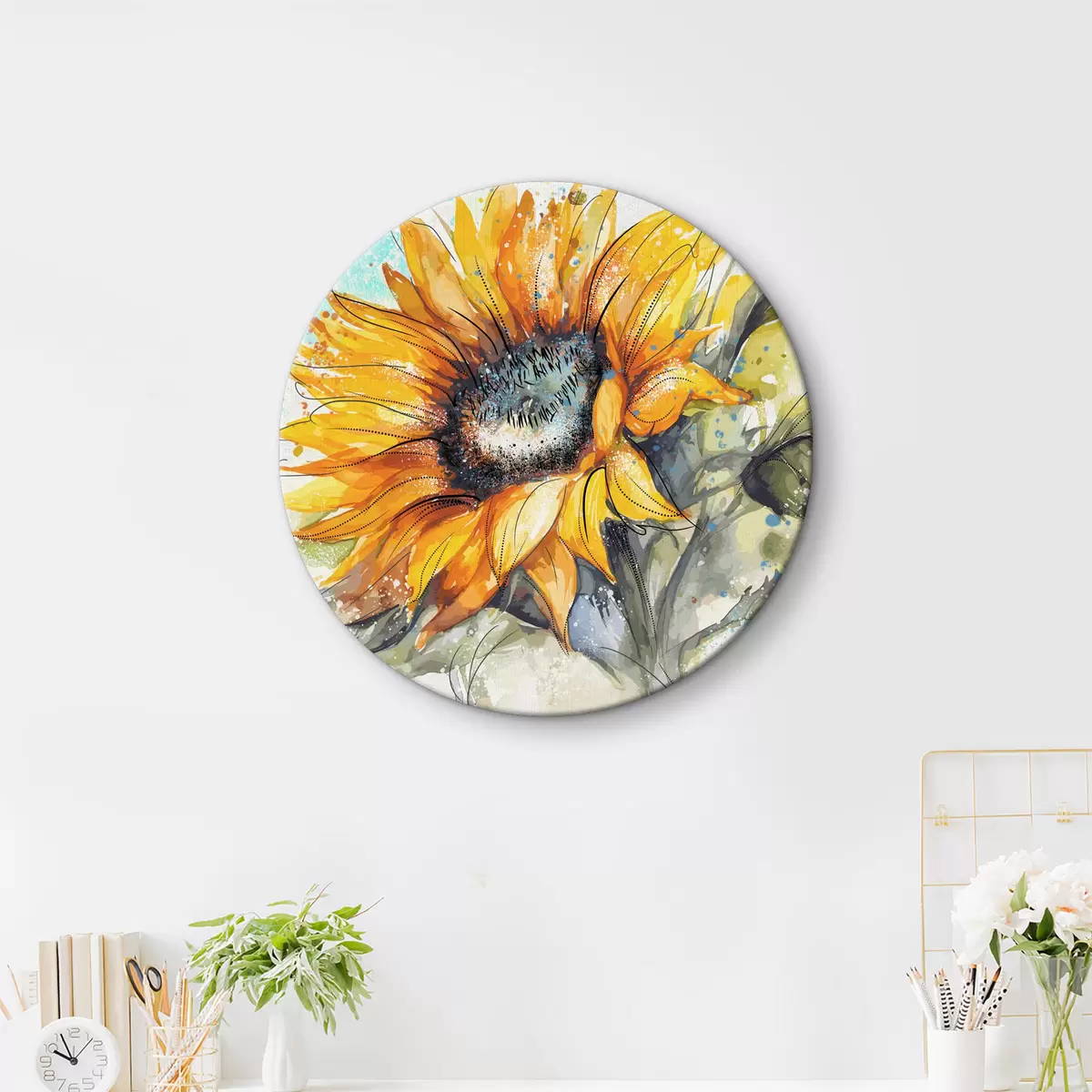 Runde Wandbilder Aquarellierte Sonnenblume mit Farbspritzern r39583