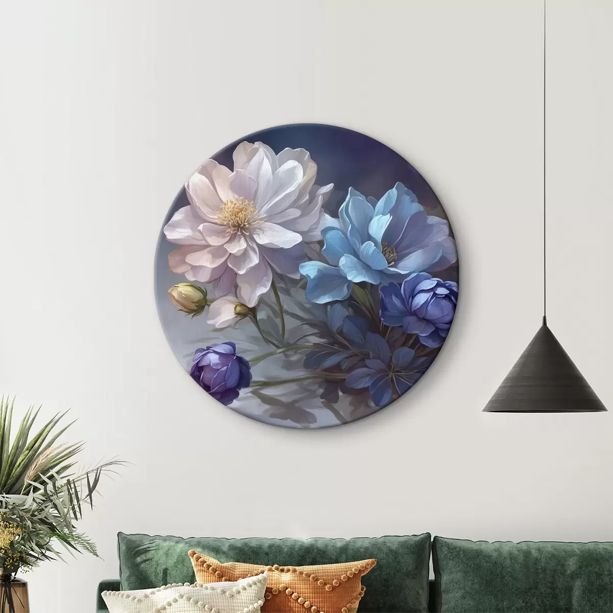 Runde Wandbilder Weiße und blaue Blumen auf unscharfen Hintergrund r39603