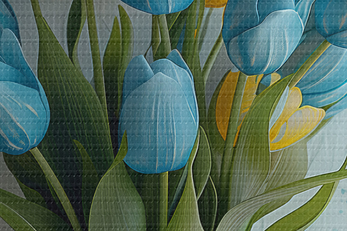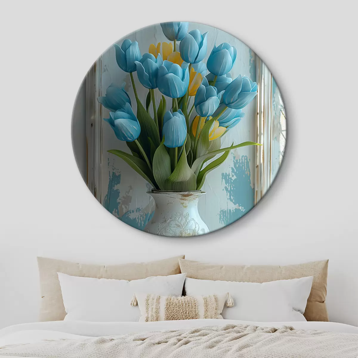 Runde Wandbilder Blaue und gelbe Tulpen in 3D: elegantes Wandbild mit weißem Rahmen, weißem und hellblauem Hintergrund und gravierter Vase r39636