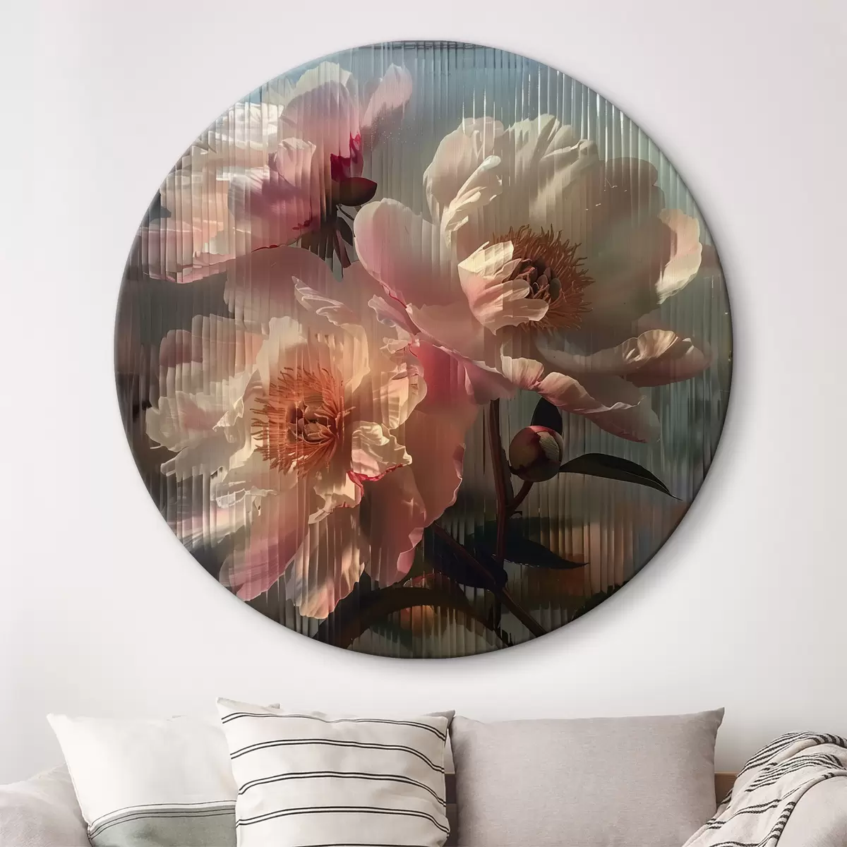 Runde Wandbilder Rosa Pfingstrosen durch Wellglas: eine fotorealistische Nahaufnahme mit Bildbrechung r39647