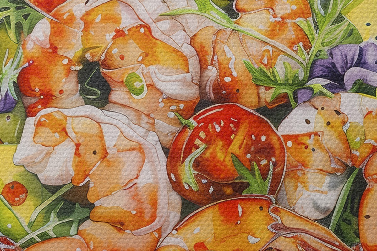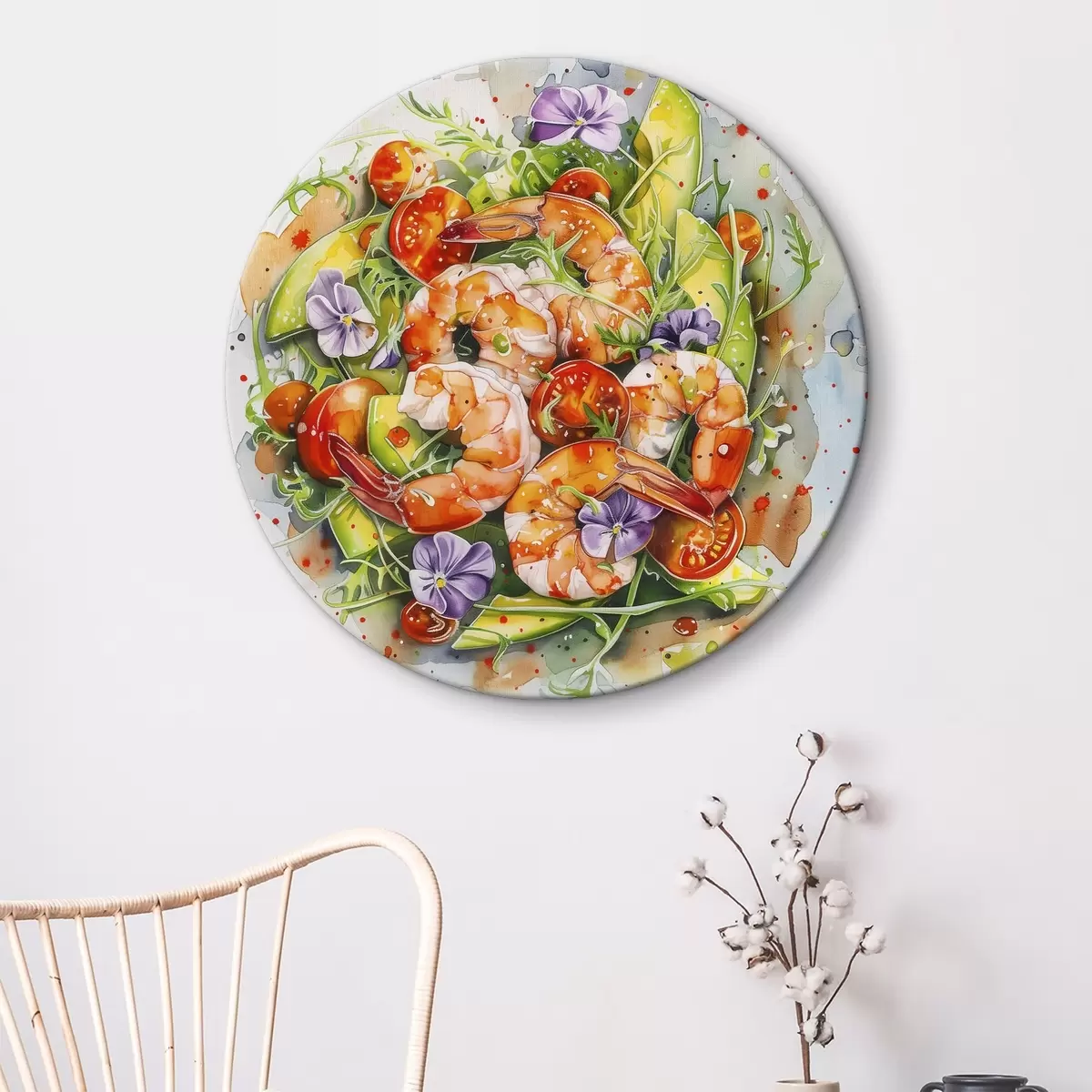 Runde Wandbilder Salat mit Avocado und Garnelen, Blumen, lecker, Food Art, Aquarell r39697