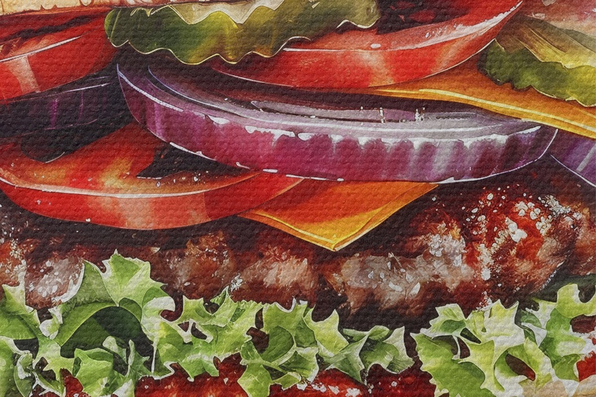 Runde Wandbilder Leckerer Burger mit Fleisch, Blumen, Aquarell, Food Art r39699