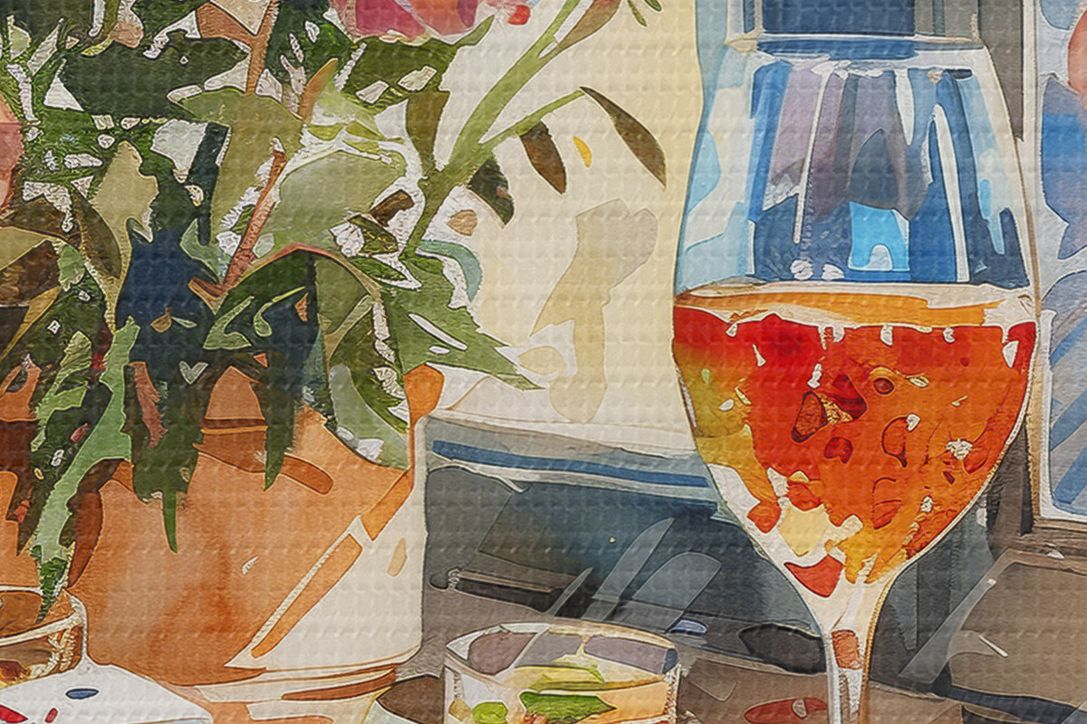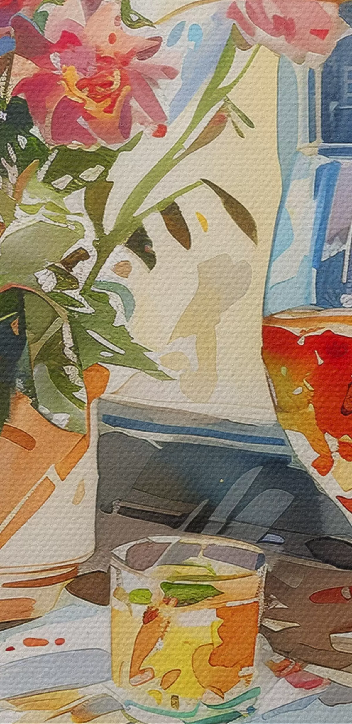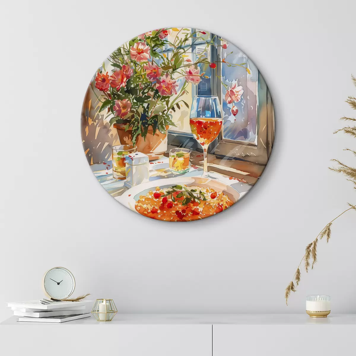 Runde Wandbilder Aquarellzweig, Sonnenlicht im Fenster, ein Glas Cocktail, Sommerblumen Nr r39707
