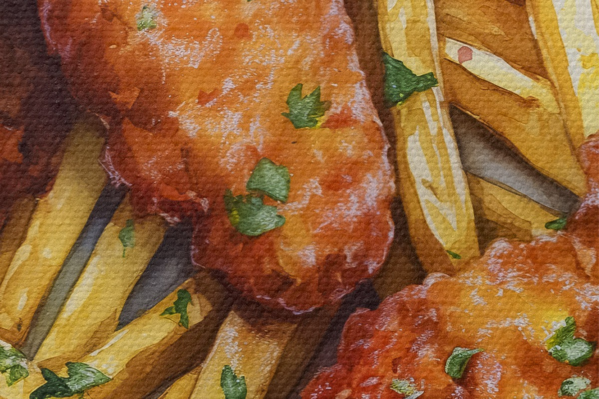Runde Wandbilder Aquarell-Food-Art, Pommes Frites mit gebratenem Huhn, köstlich Nr r39708