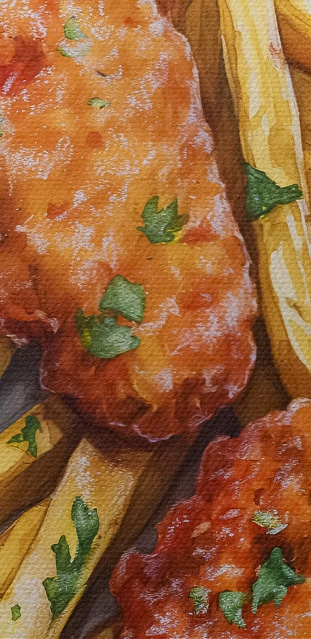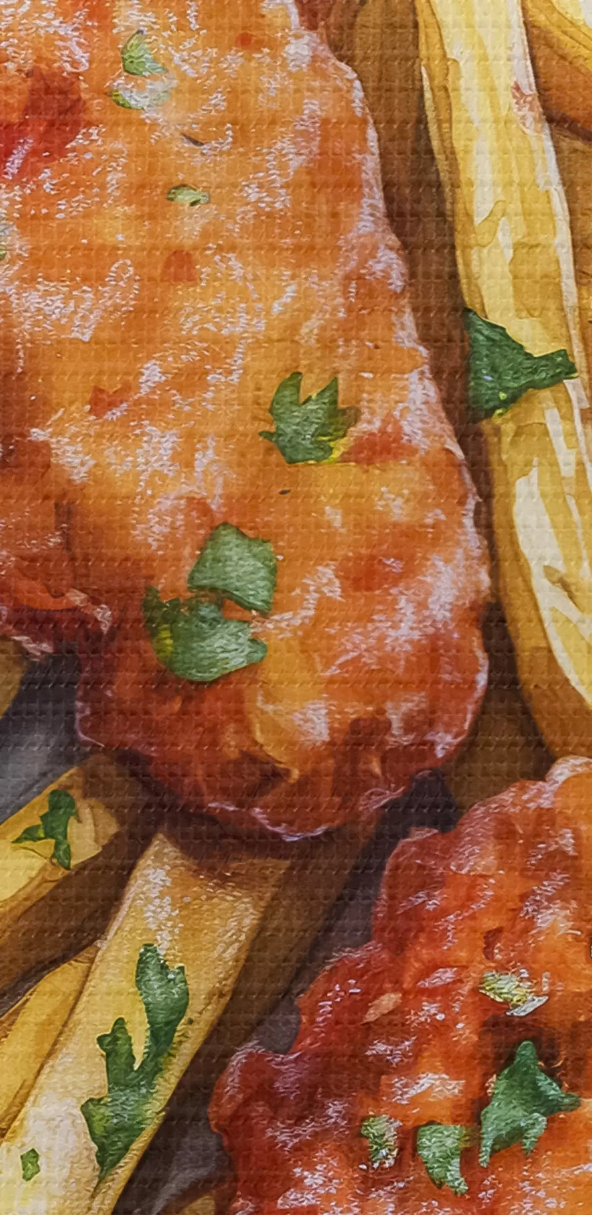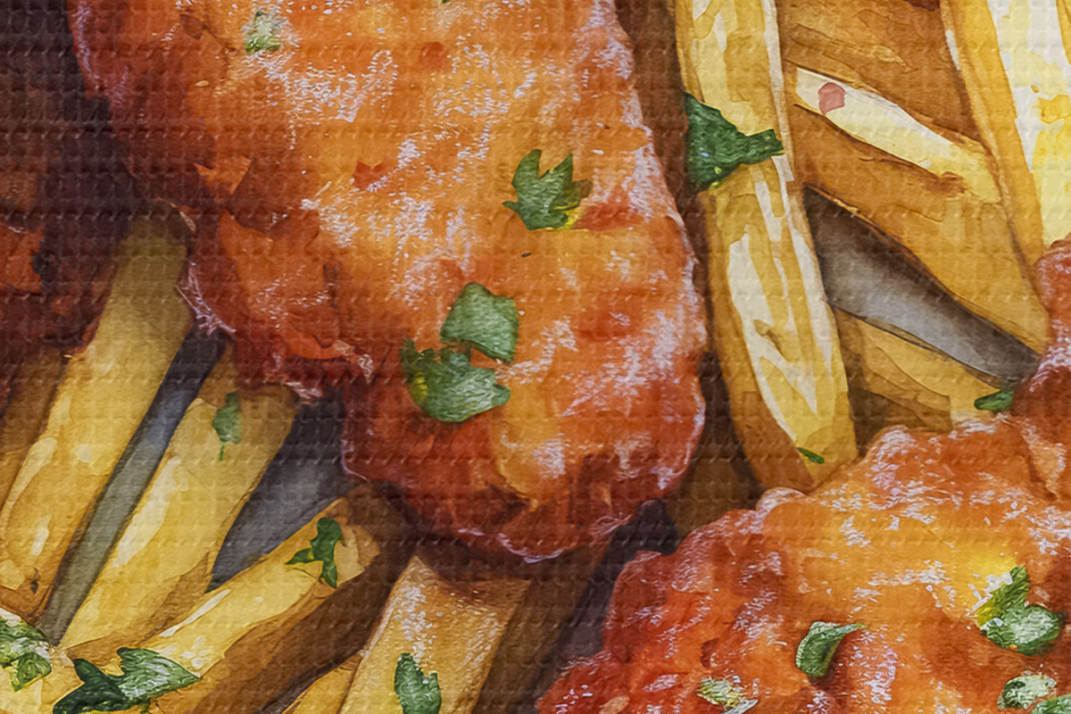 Runde Wandbilder Aquarell-Food-Art, Pommes Frites mit gebratenem Huhn, köstlich r39708