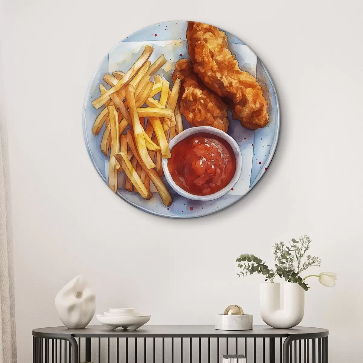 Runde Wandbilder Aquarell Street Food, Pommes Frites mit gebratenem Huhn, lecker Nr r39709