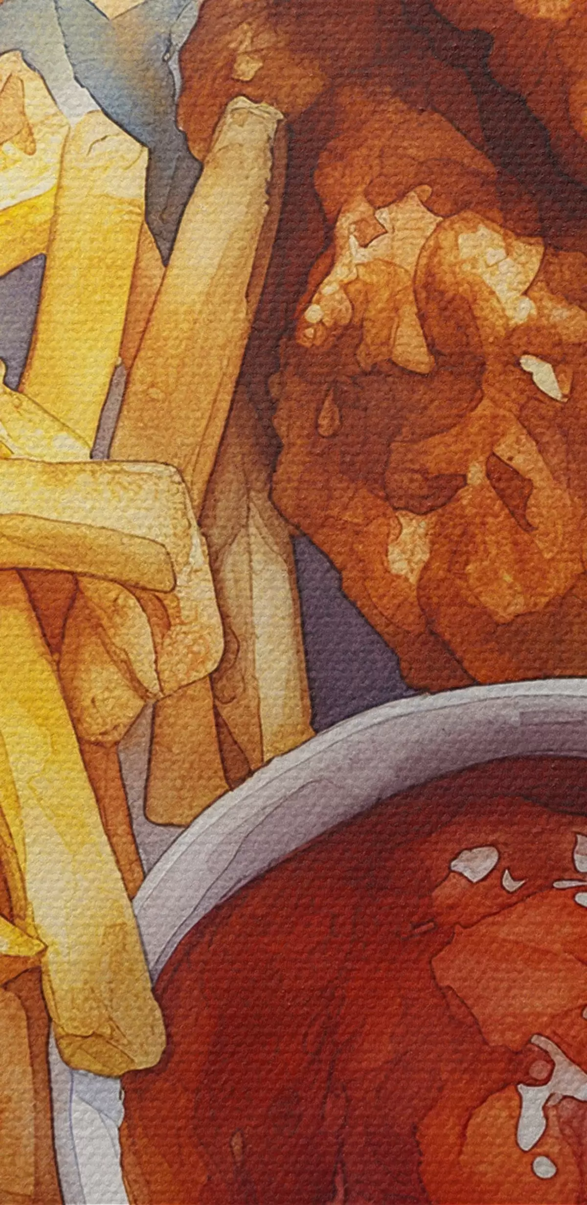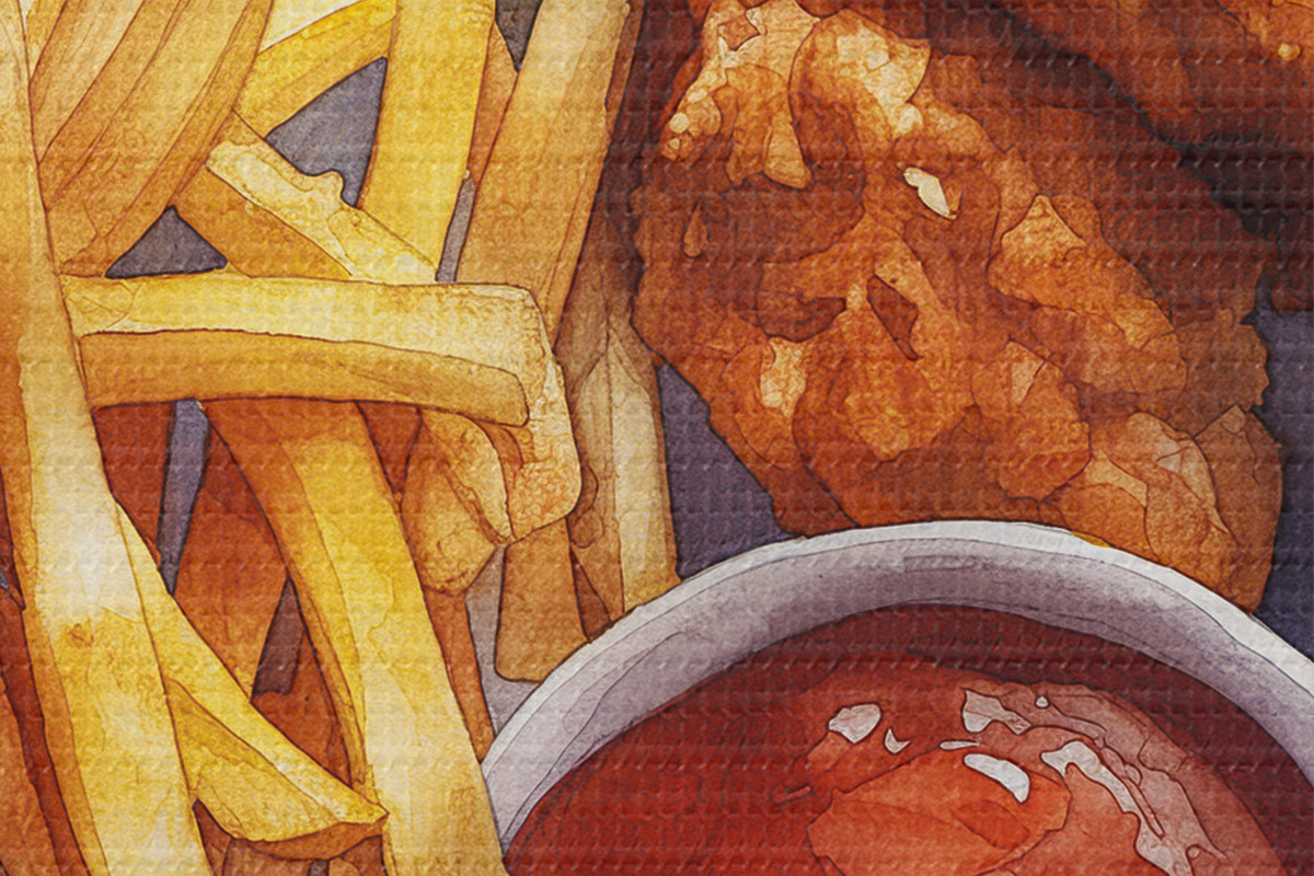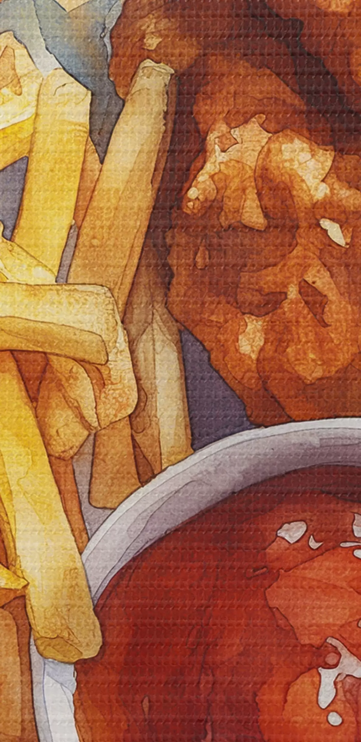 Runde Wandbilder Aquarell Street Food, Pommes Frites mit gebratenem Huhn, lecker r39709