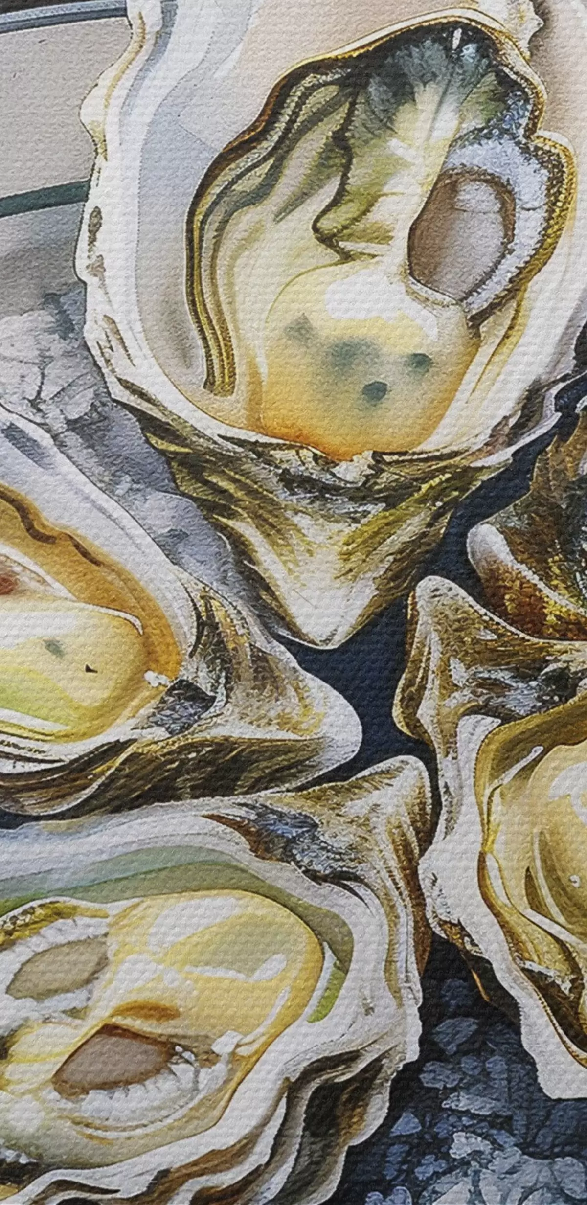 Runde Wandbilder Elegante Austern auf dem Teller, Zitronen und Blumen, Sommerfarben, mediterran r39710