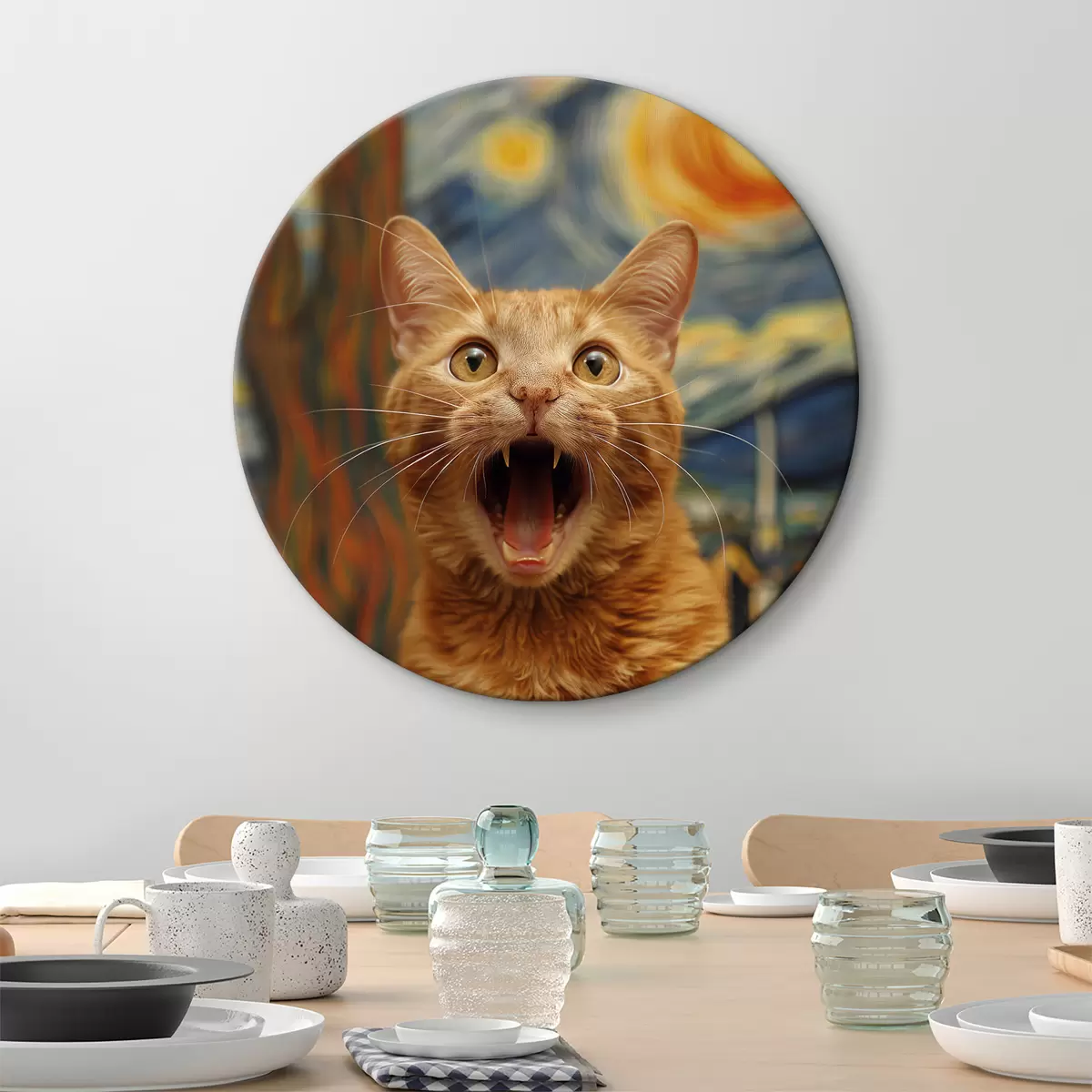 Runde Wandbilder Gemälde „Der Schrei“ im Van Gogh-Stil mit einer Katze r39724