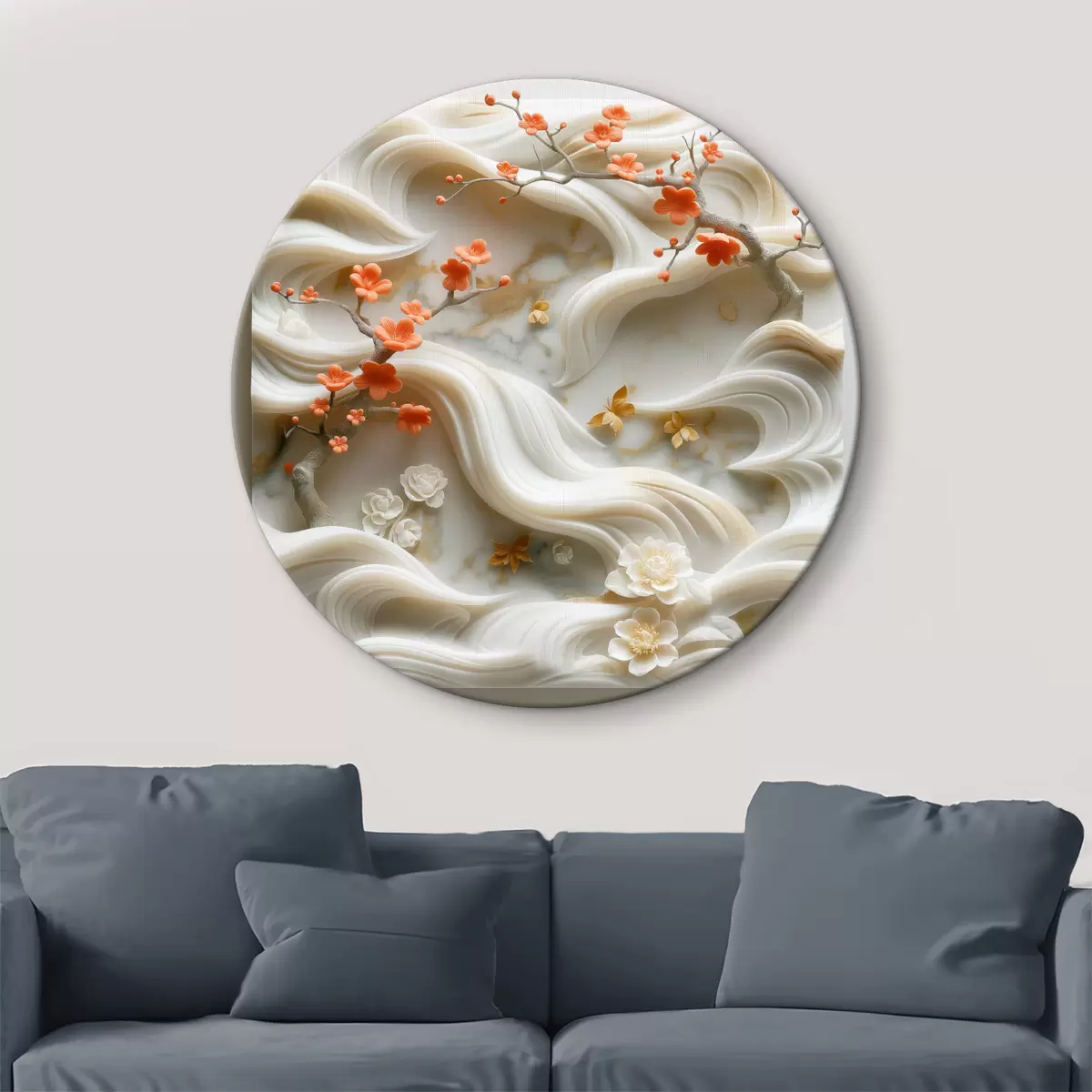 Runde Wandbilder Himmlische 3D-Gartenszene aus weißem Marmor als Flachrelief mit fließender Flora und Fauna r39730
