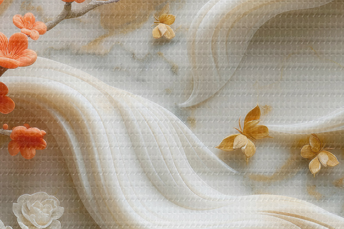 Runde Wandbilder Himmlische 3D-Gartenszene aus weißem Marmor als Flachrelief mit fließender Flora und Fauna Nr r39730
