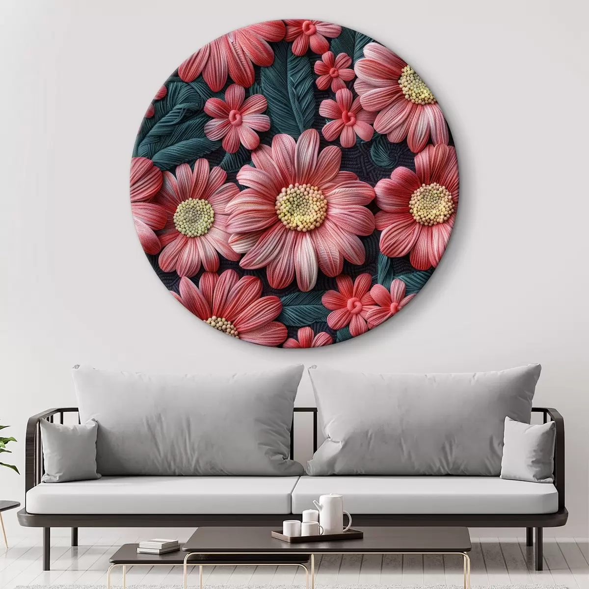 Runde Wandbilder 3D-Stickerei von rosa Gerbera aus Wollgarn auf einem gesteppten Hintergrund Nr r39746