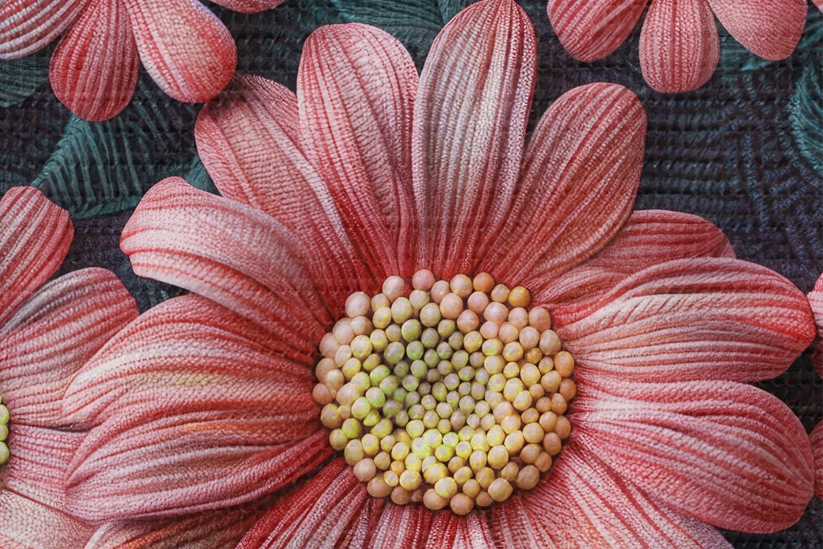 Runde Wandbilder 3D-Stickerei von rosa Gerbera aus Wollgarn auf einem gesteppten Hintergrund r39746