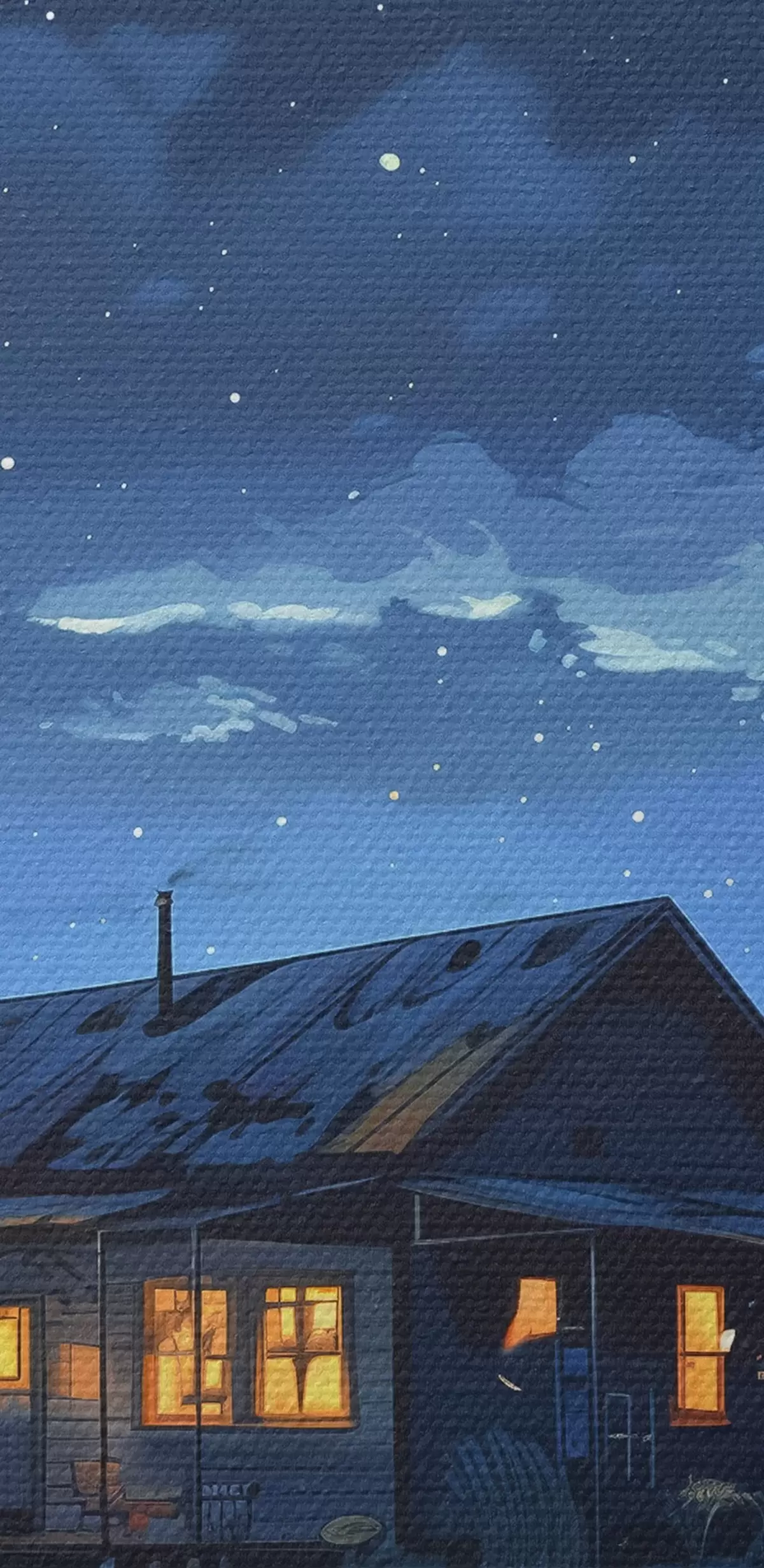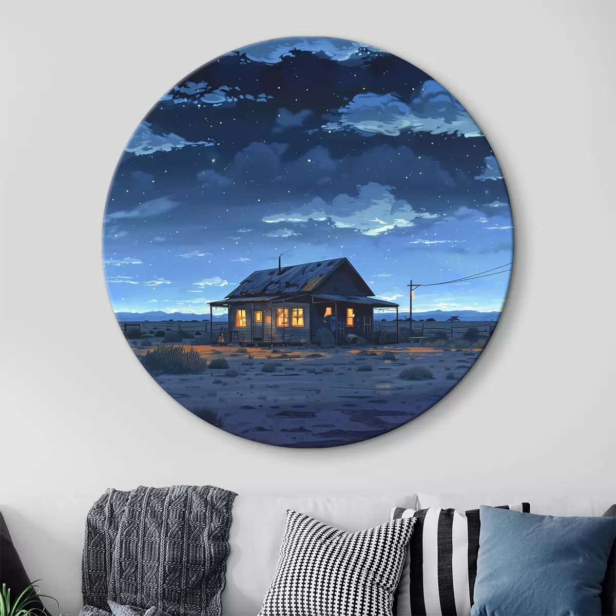 Runde Wandbilder Bauernhaus in der Wüste, sternenklarer Nachthimmel, Wolken, Naturlandschaft r39771