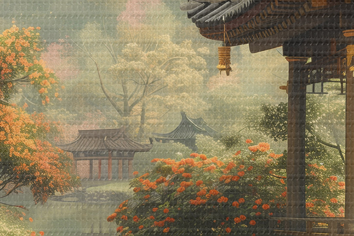 Runde Wandbilder Japanischer Park mit blühenden Bäumen und Blumen, Wald, Gartenhaus, See r39772