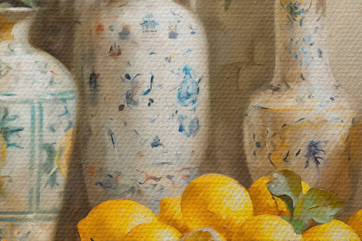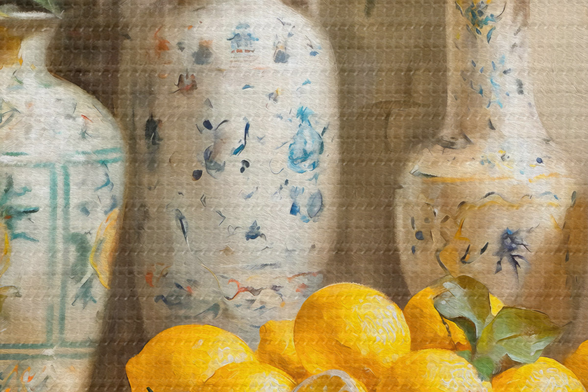 Runde Wandbilder Zitronen und Vintage Vasen auf dem Tisch r39833