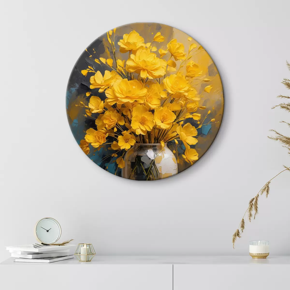 Runde Wandbilder Gelbe Blumen in der Vase auf buntem Acryl-Hintergrund Nr r39854