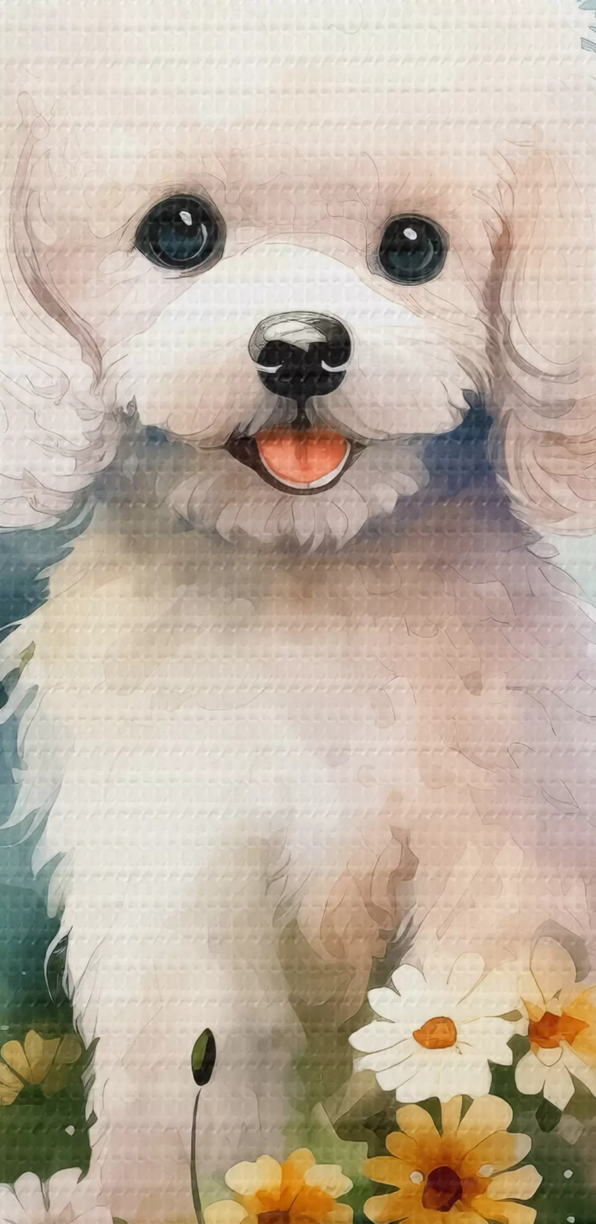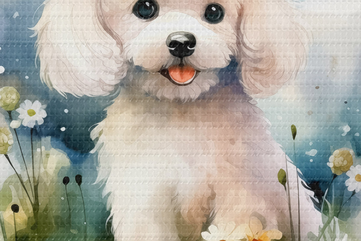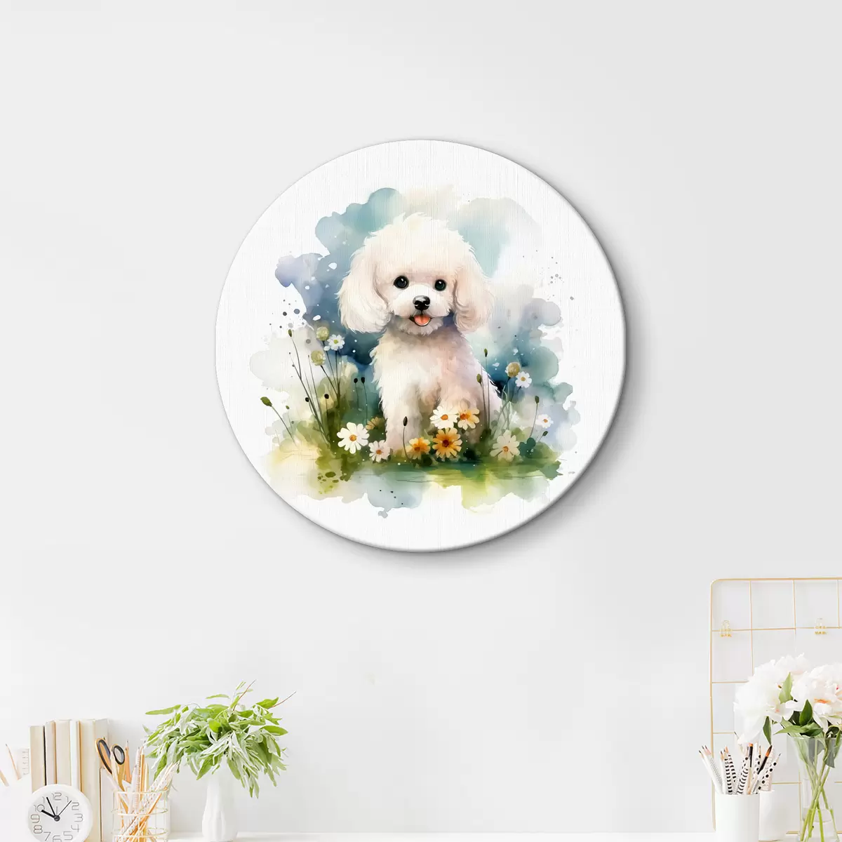 Runde Wandbilder Kleiner weißer Pudel sitzt im Blumenaquarell Nr r39928