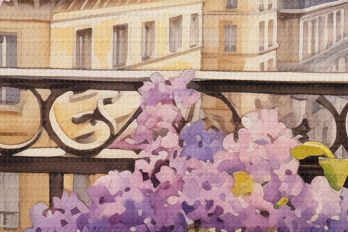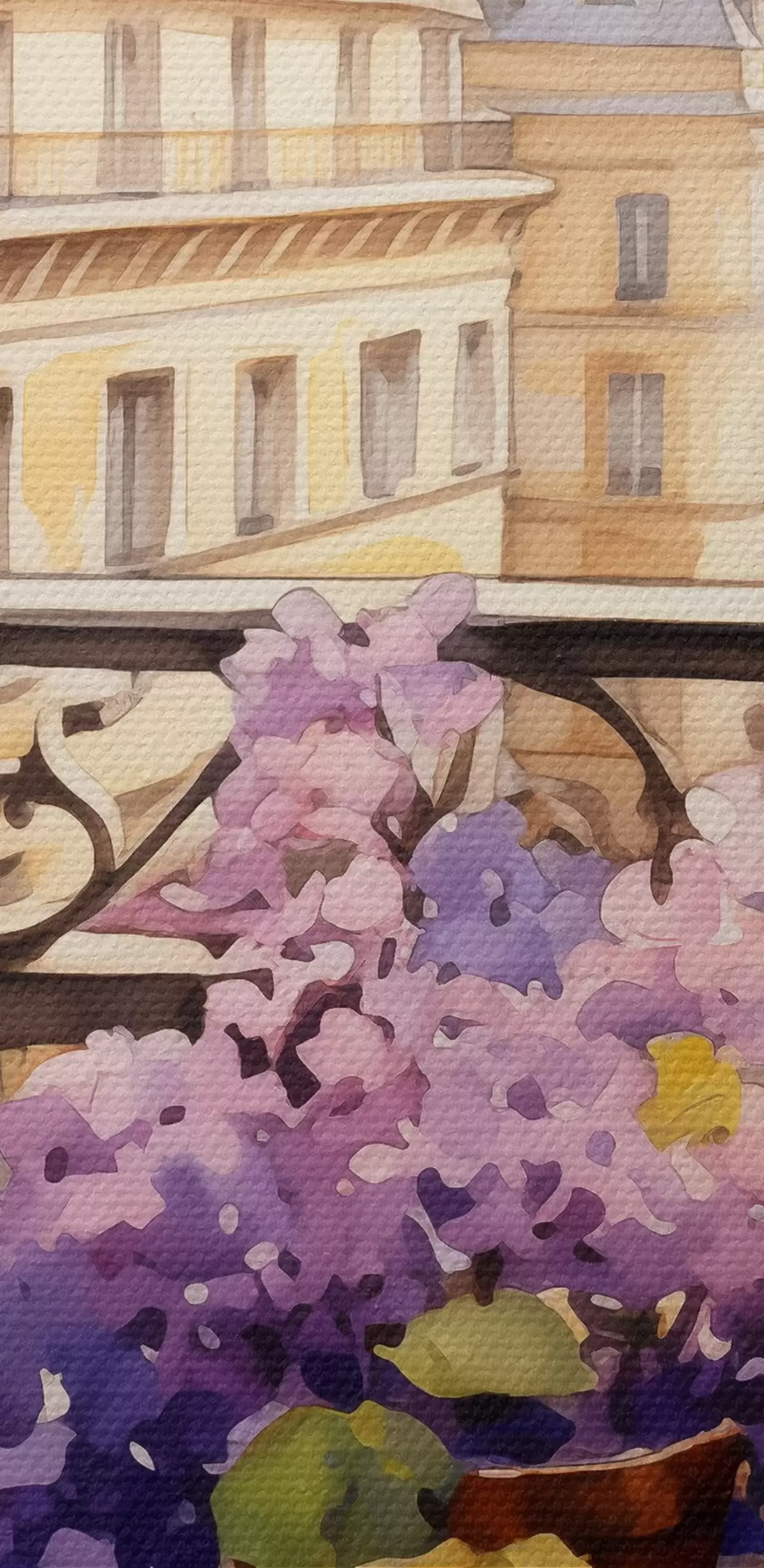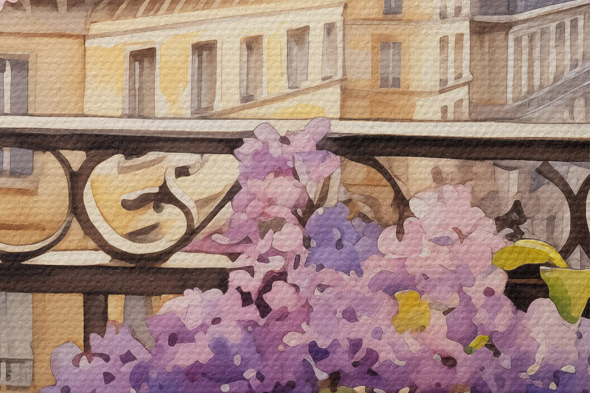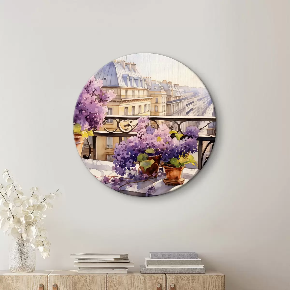 Runde Wandbilder Veilchen in einem Topf auf einem Balkon in Paris Aquarell r39931