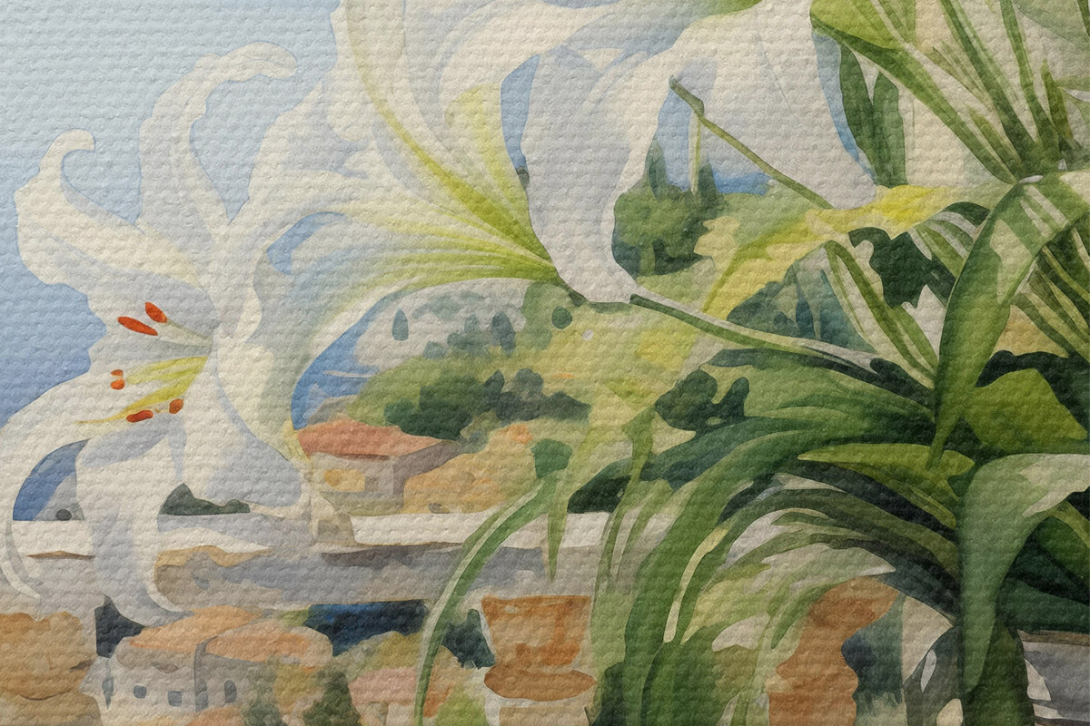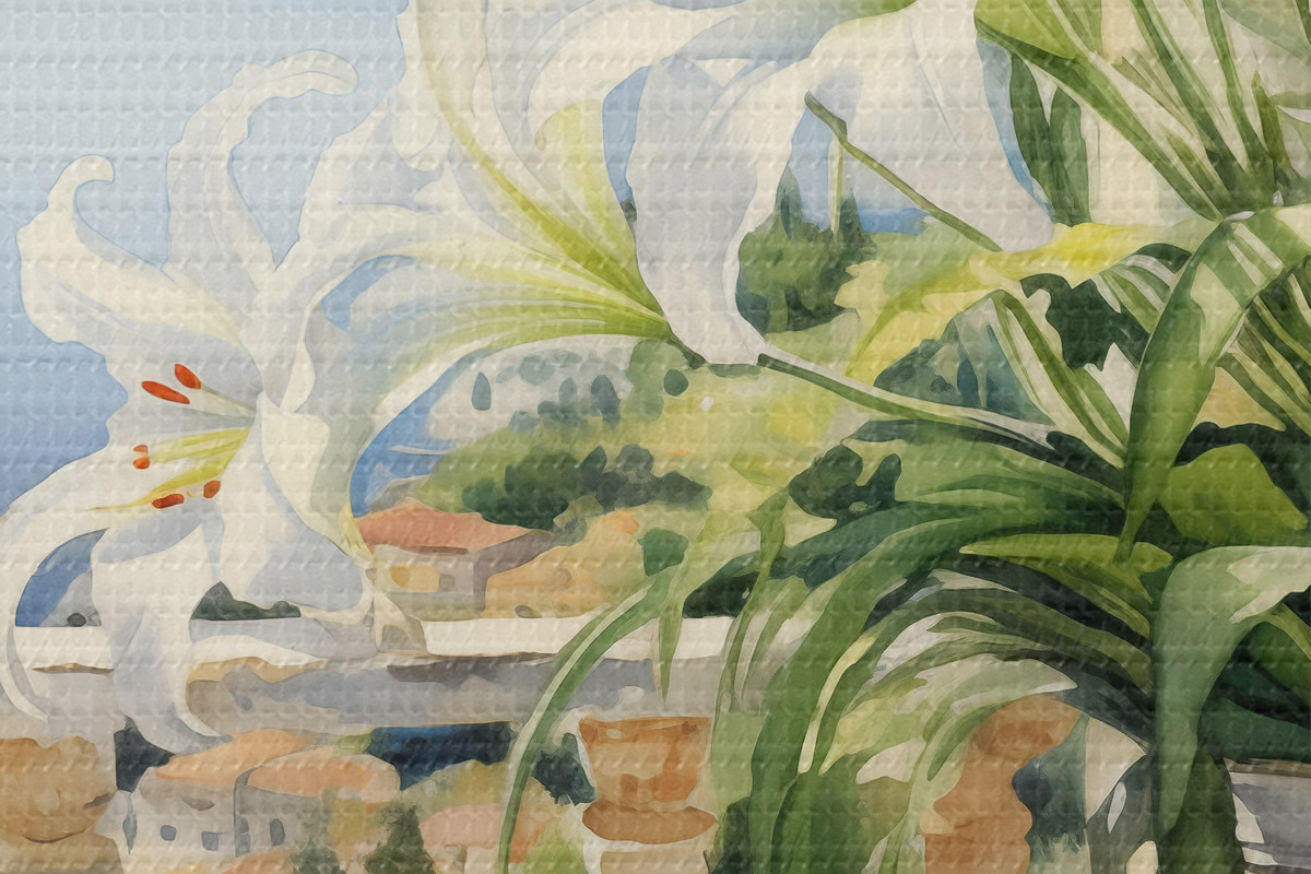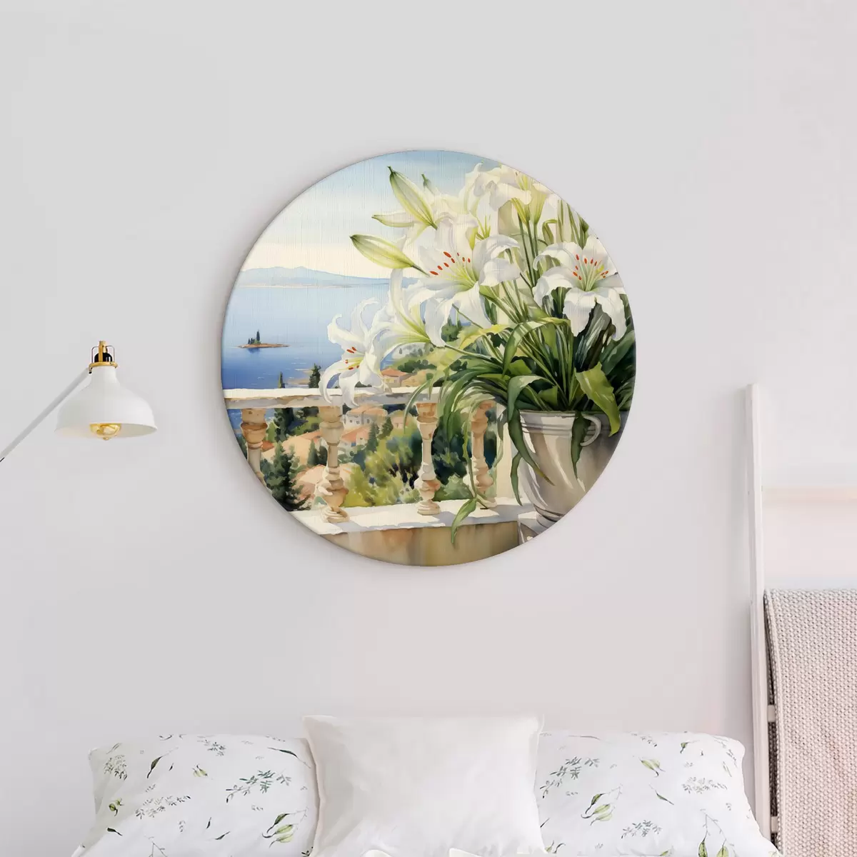 Runde Wandbilder Weiße Lilien in einem Topf auf einem Balkon vor dem Hintergrund der Bucht Aquarell r39932