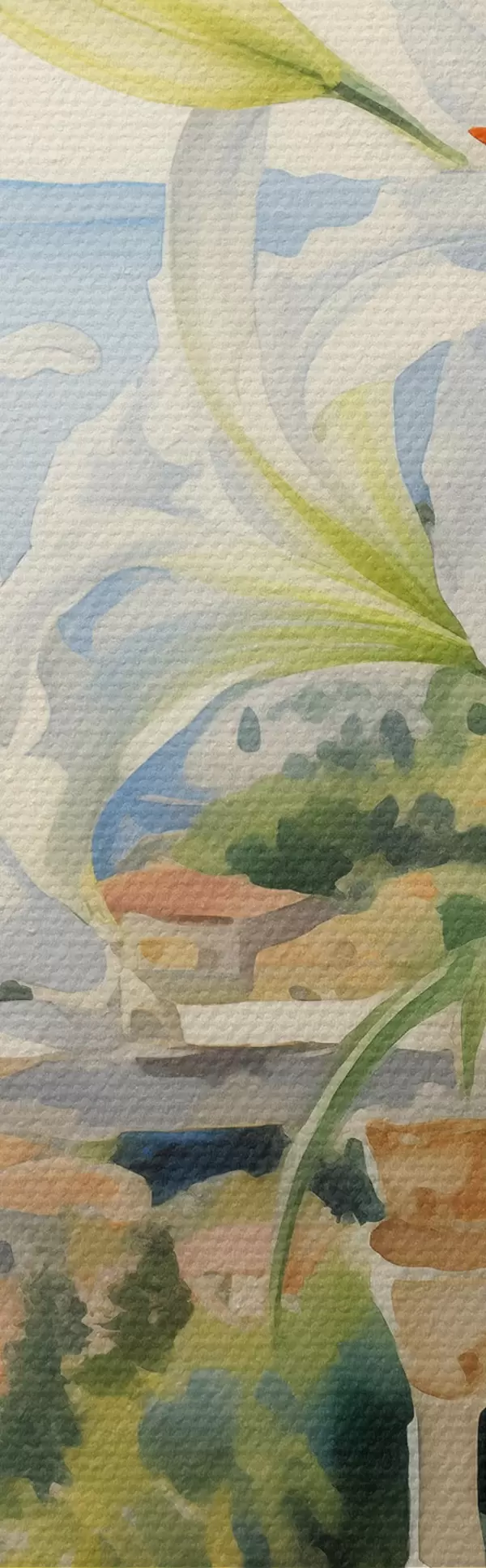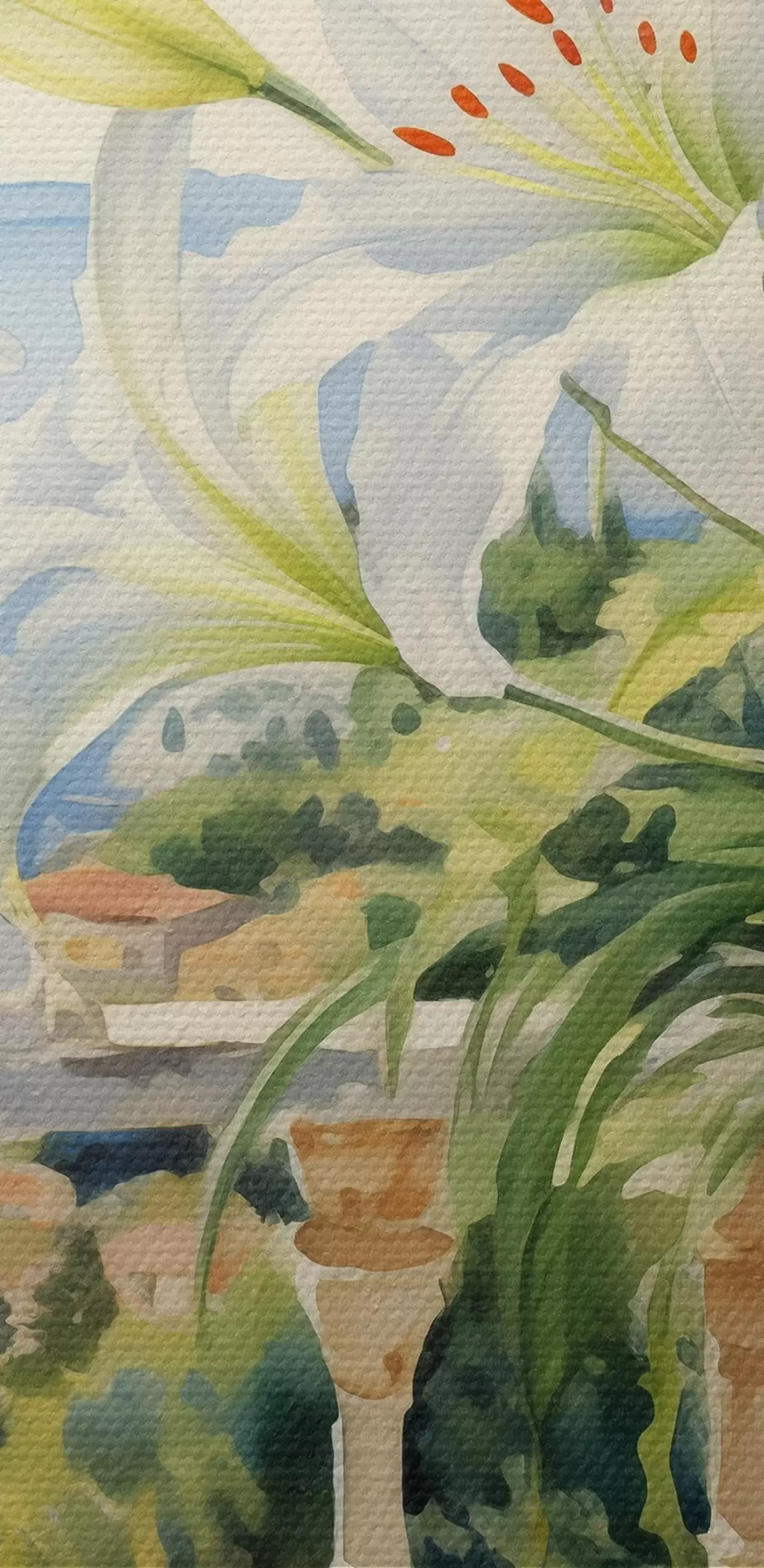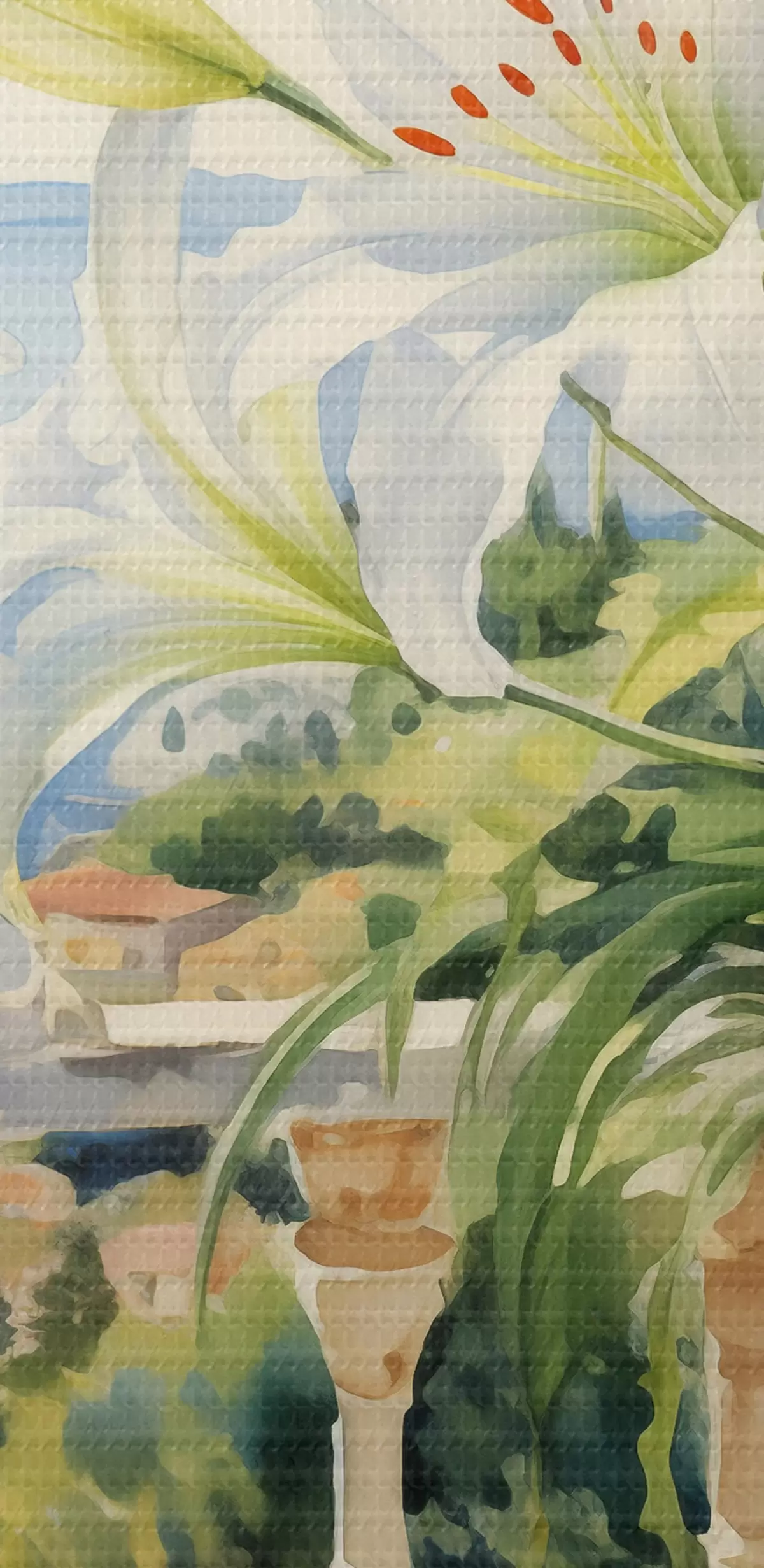 Runde Wandbilder Weiße Lilien in einem Topf auf einem Balkon vor dem Hintergrund der Bucht Aquarell Nr r39932